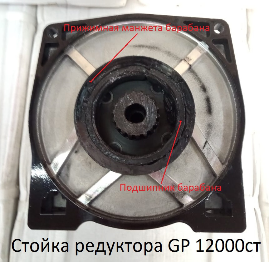 Редукторная стойка (опора) со стороны барабана. Прижимная манжета к щеке барабана на месте, подшипник скольжения барабана тоже на месте.