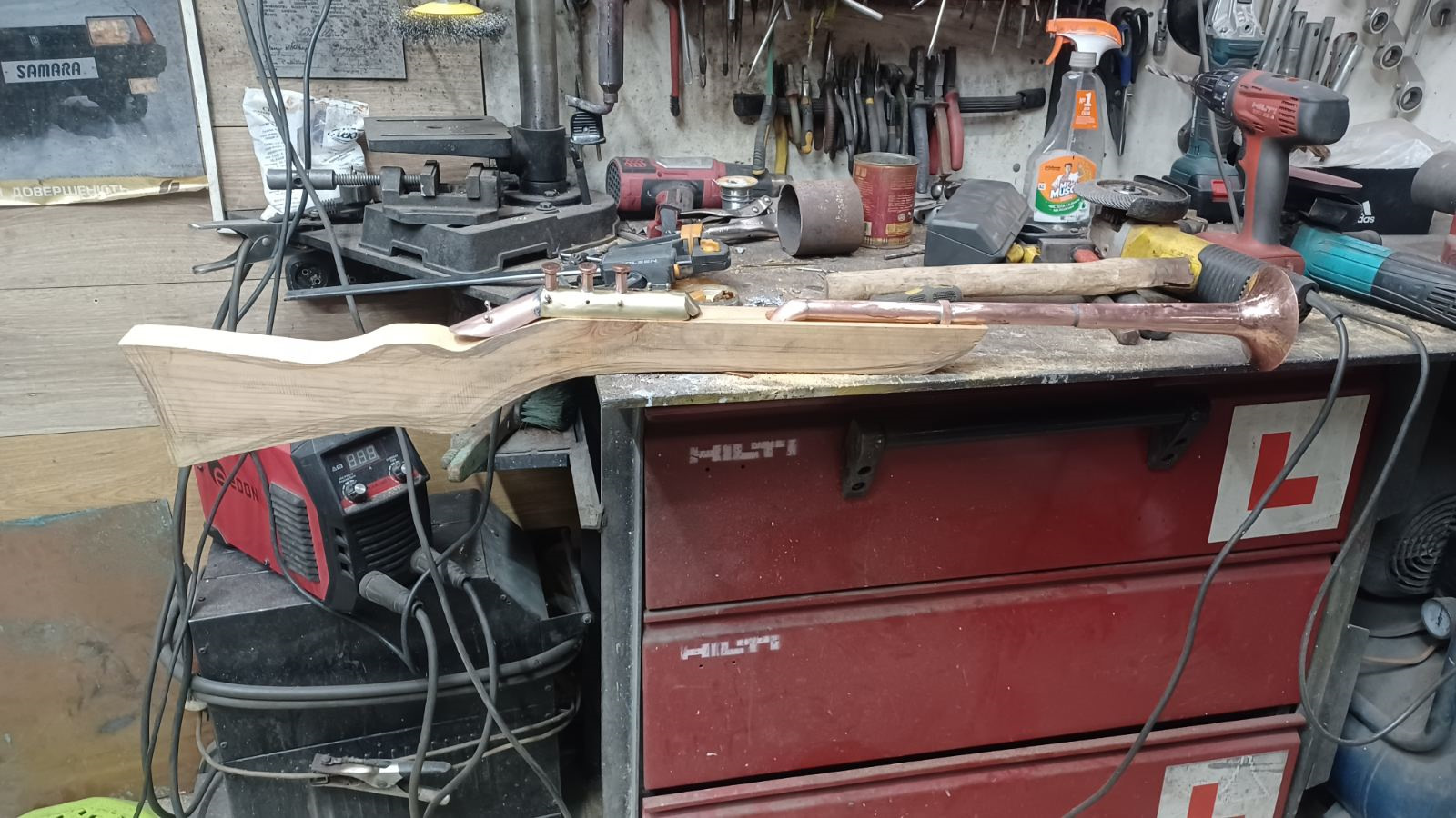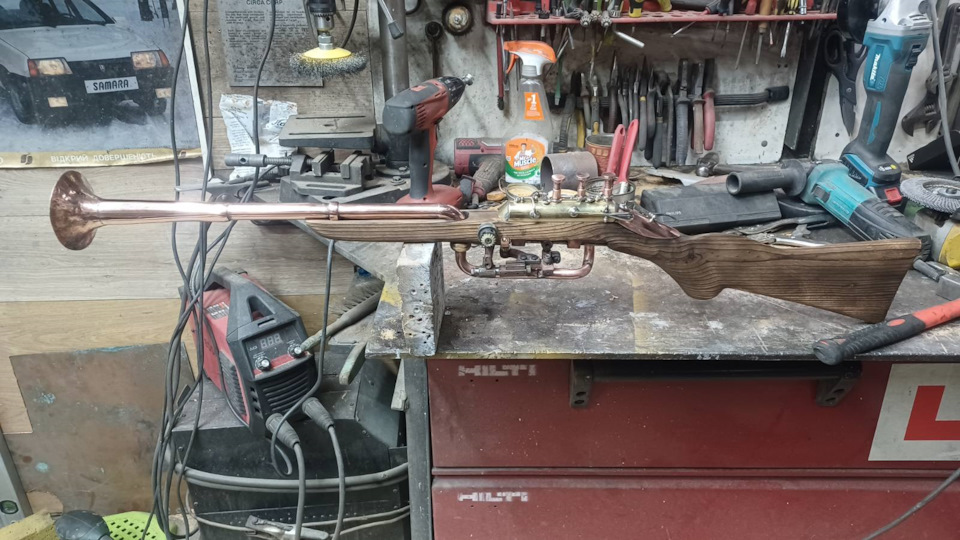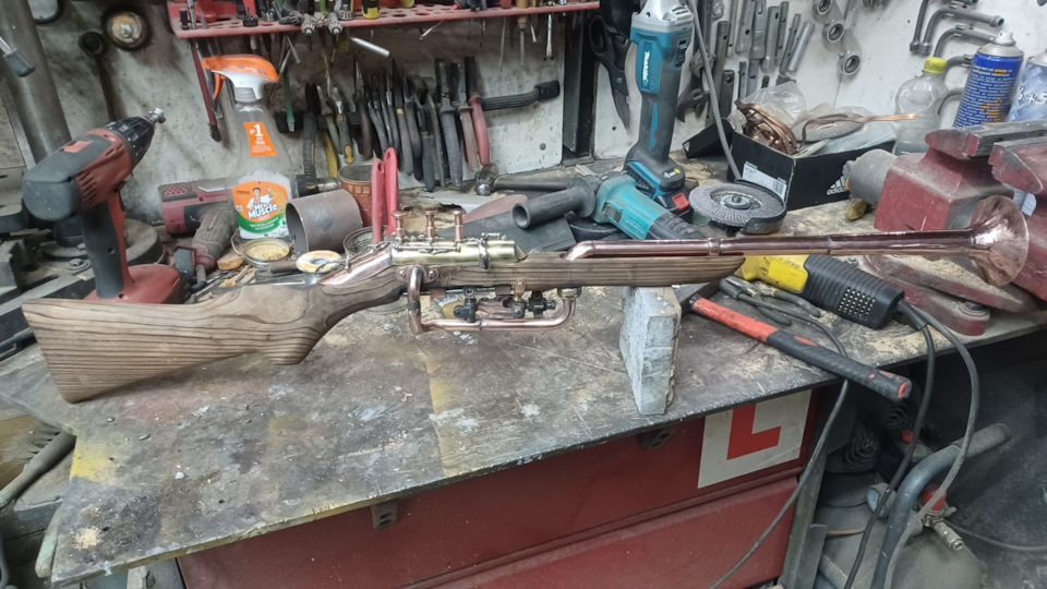 Тема Стимпанк для меня интересная хоть и не так давно она меня привлекла, правда несколько изделий таки мне удалось воплотить в жизнь, это были шахматы из автомобильных клапанов, телефон старинный настенный типа как у профессора Преображенского)) но тоже в стиле стимпанк и по совместительству ключница, использовались оригинальные детали от телефона эриксон 100 летней давности, и вот ружье, Года 4 назад увидел в интернете картинку похожую и се ни как не мог найти настоящую трубу поломанную, не хотелось покупать целую и цены на них кусаются, , и глупо для проекта покупать и портить рабочий инструмент, Пришлось изготавливать и чеканить из меди в ручную, почему медь? потому что не было латуни необходимого размера. На ютубе много разных вариантов этого стиля и довольно таки интересные варианты есть, кто то вообще целые выставки своих работ открывает, и довольно таки успешные, а я пока начинающий стимпанкер)) кстати есть люди которые и не слышали о таком ни когда, нашлись и такие)