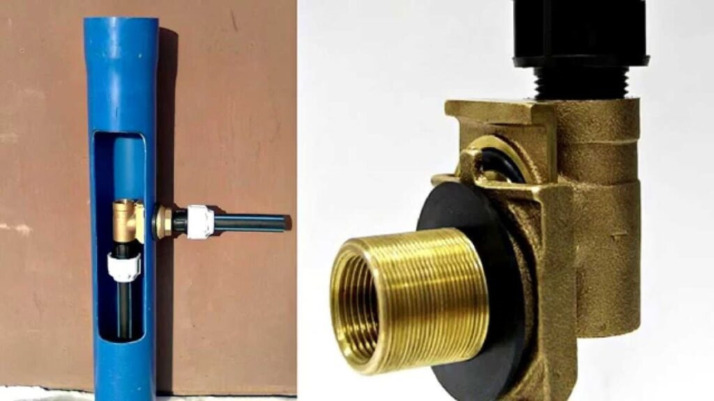 Скважина на улице. К ее стенке на некой глубине в земле прикручена неподвижная часть адаптера. И от не труба с водой идёт в дом. Подвижная часть соединена с трубой насоса и к ней прикручена приблуда в виде трубы для монтажа. Насос на трубе опускается в скважину и подвижная часть адаптера встаёт в неподвижную. Приблуда выкручивается и скважина закрывается заглушкой.
