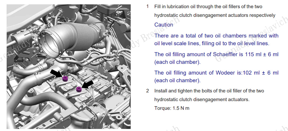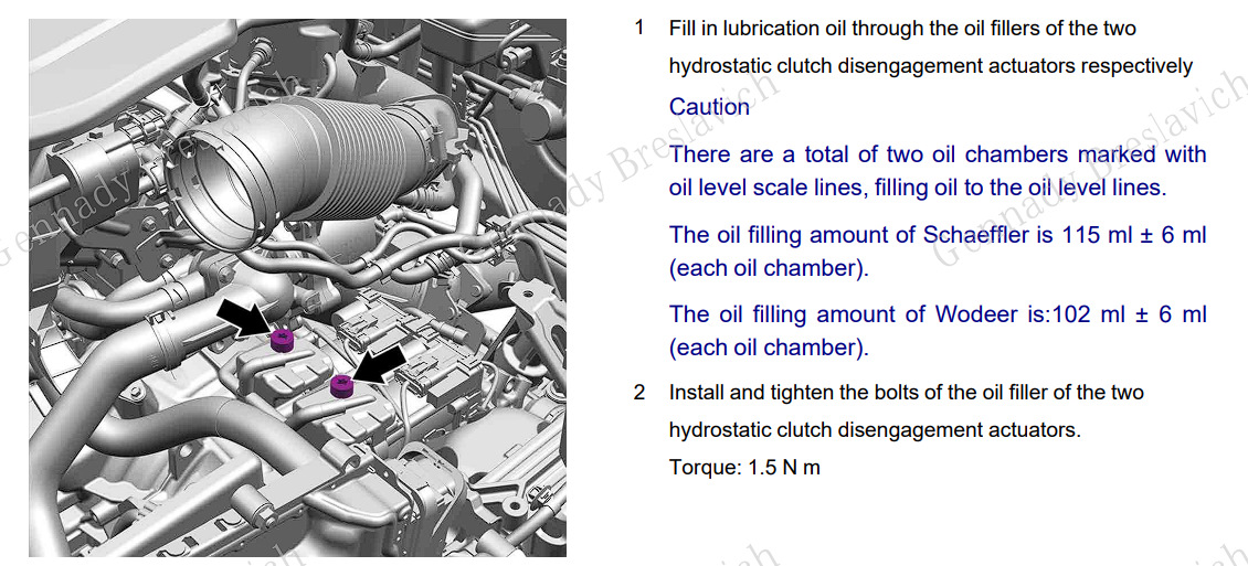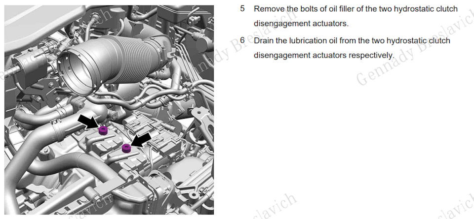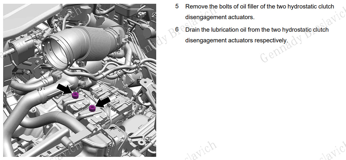 А вот как описана процедура слива и заправки масла привода выключения гидростатического сцепления (два бачка на коробке, масло в которых все так рвутся заменить)