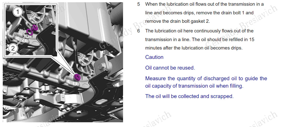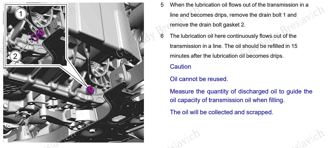 5. Когда смазочное масло начнет вытекать из трансмиссии по трубке и станет капать, снимите сливной болт 1 и снимите прокладку сливного болта 2.