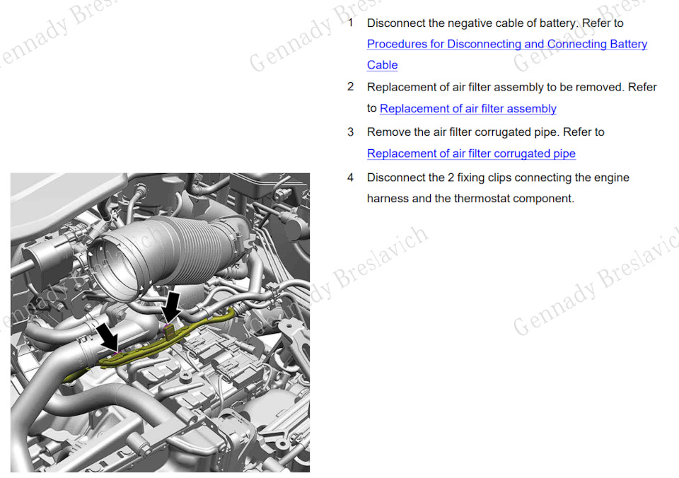 3. Отсоедините 2 фиксирующих зажима, соединяющих жгут двигателя и компонент термостата