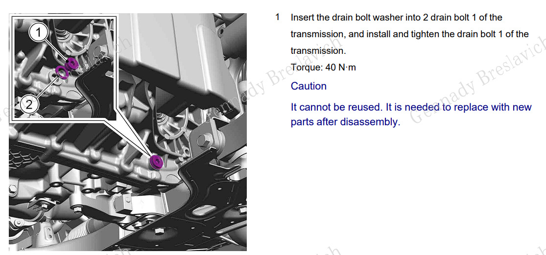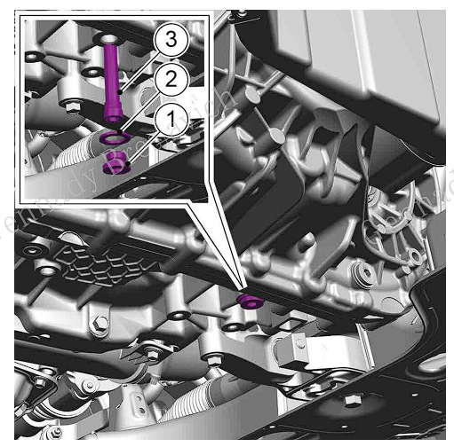 1. Вставьте шайбу сливного болта в сливной болт 1 трансмиссии, затем установите и затяните сливной болт 1 трансмиссии.