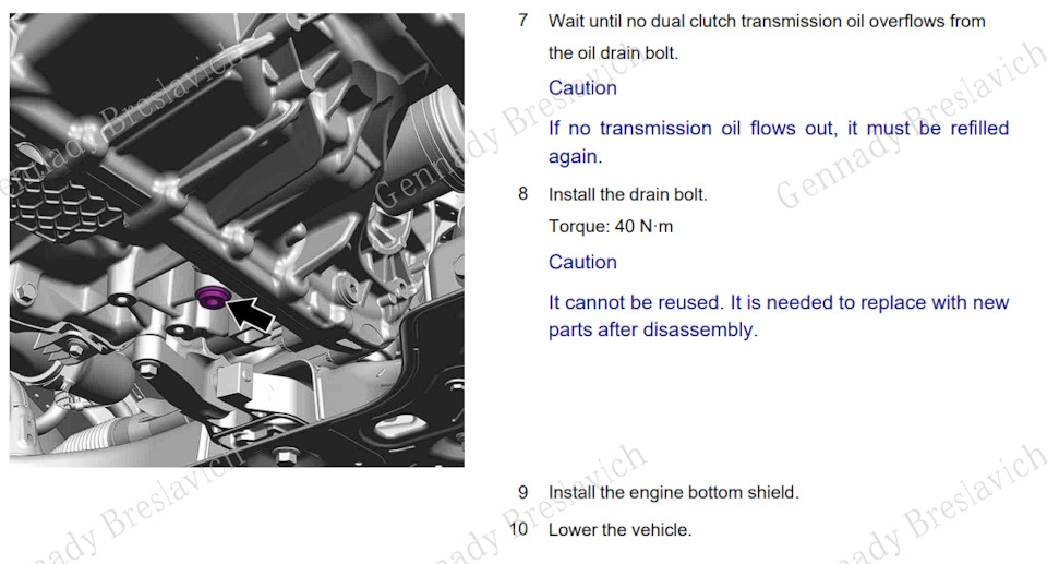 7. Дождитесь, пока масло трансмиссии с двойным сцеплением перестанет вытекать из болта слива масла.