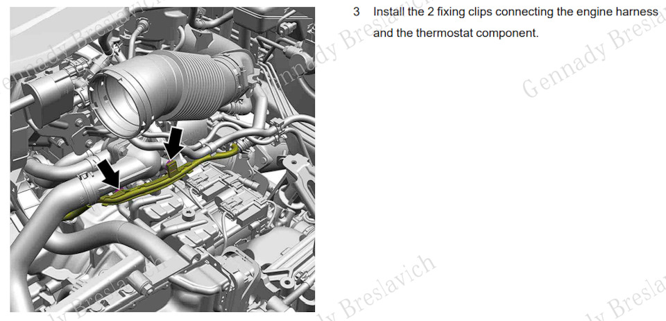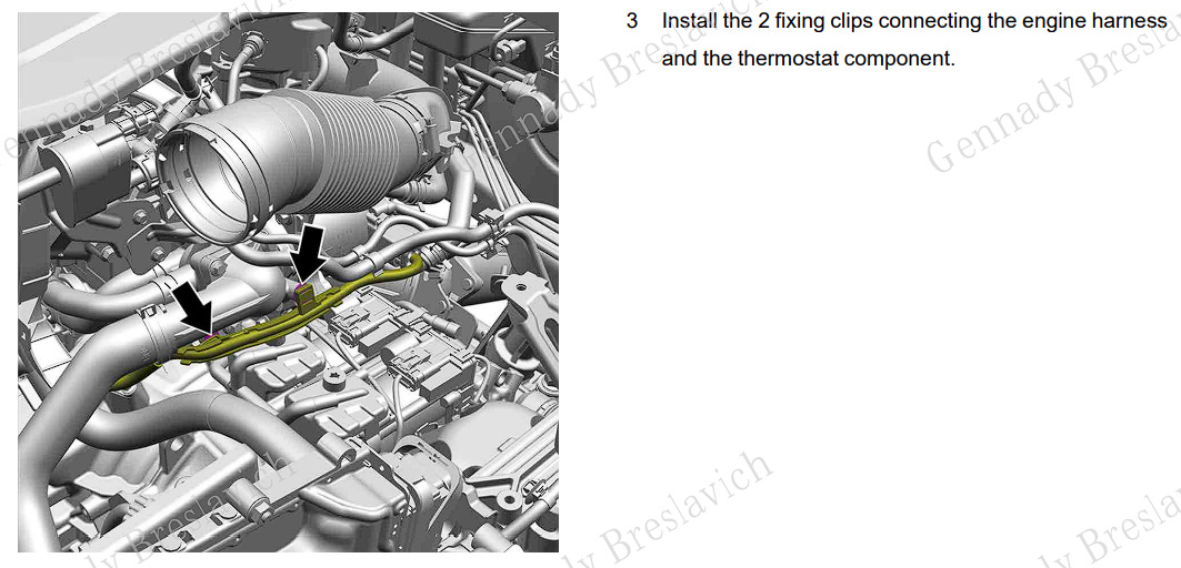 3. Установите два фиксирующих зажима, соединяющих жгут двигателя и компонент термостата