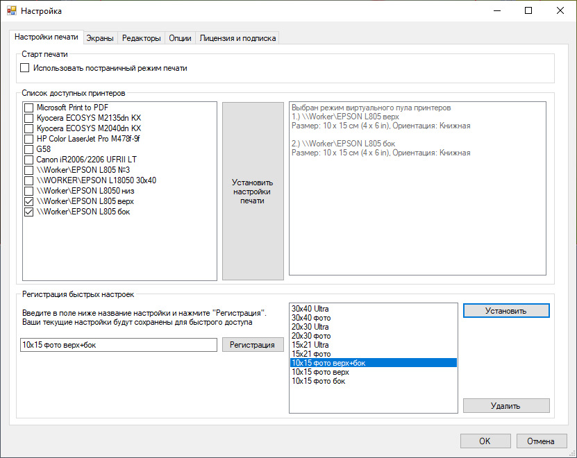 Прямо в программе сохраняешь настройки принтеров, присваивая им своё название какое хочешь. Переключаешся между ними в меню. Программа хранит все эти настройки в каталоге где она установлена. При следующем запуске автоматически включается тот режим (количество принтеров на которые разбрасываются фотки, их индивидуальные настройки…). При выборе нескольких принтеров после нажатия на кнопку установить настройки запускается последовательно окно драйвера для каждого принтера (настройки печати) по очереди. Каждый раз это делать не надо, просто придумай имя этой комбинации настроек и сохрани в программе. Драйвер передаёт все настройки в мою программу и она их запоминает.