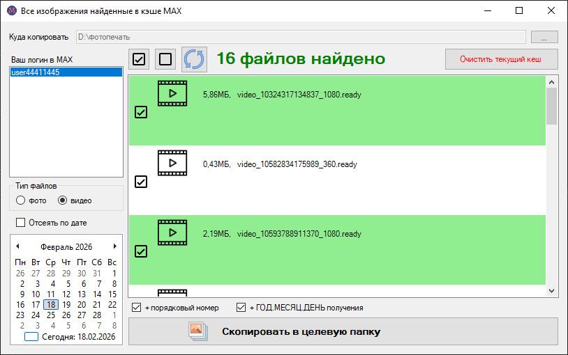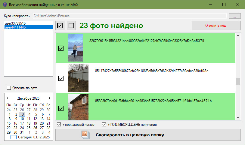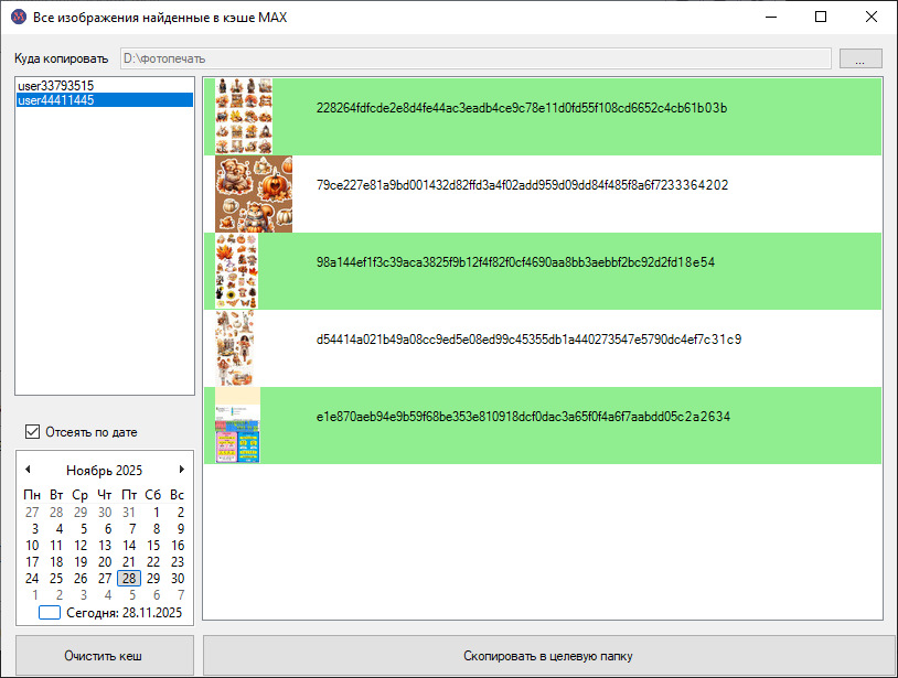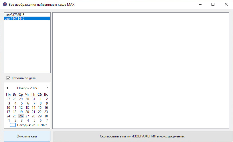 Поэтому я прикрутил кнопки "очистить кэш". Все фотки удаляются. Далее ты открываешь в максе только тот чат который нужен, пролистываешь сообщения с фотками и в тот момент когда они показываются на экране, эти фотки автоматически скачиваются заново и в итоге у тебя в моей программе будут показаны только те фото которые нужно. Единственный момент, когда очищаешь кеш, макс должен быть закрыт и в трее не висеть, иначе кеш у макса ещё висит в оперативке и скачиваться заново не будет, пока не закроешь и не откроешь макс заново.