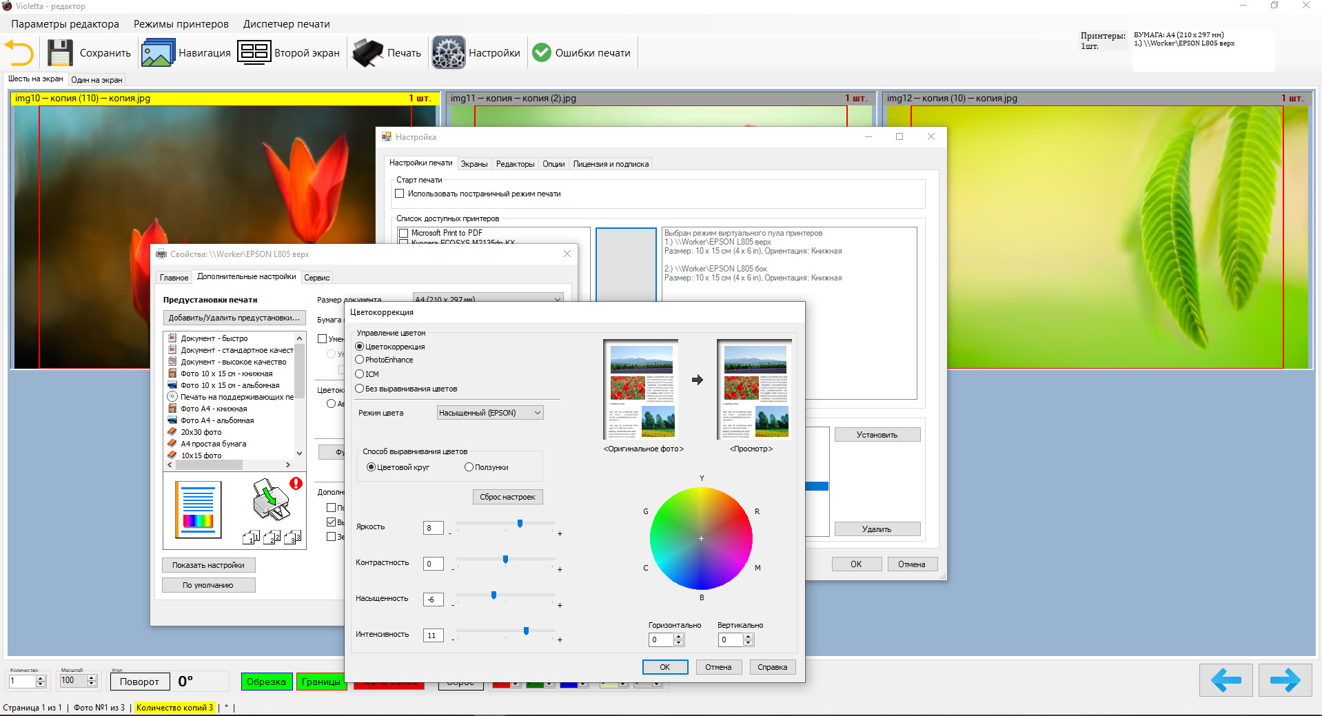 Фото раскидываются на принтеры поровну. Предусмотрена отправка порционно по 6 штук, т.е. оператор откорректировал первые 6 штук и при переходе к следующим 6, первые ушли в печать. Всё как на фотолаборатории. Скорость отдачи клиенту заказа напрямую зависит от количества принтеров. 3 принтера Epson L805 справятся с заказом 100шт 10х15 через 22 минуты.