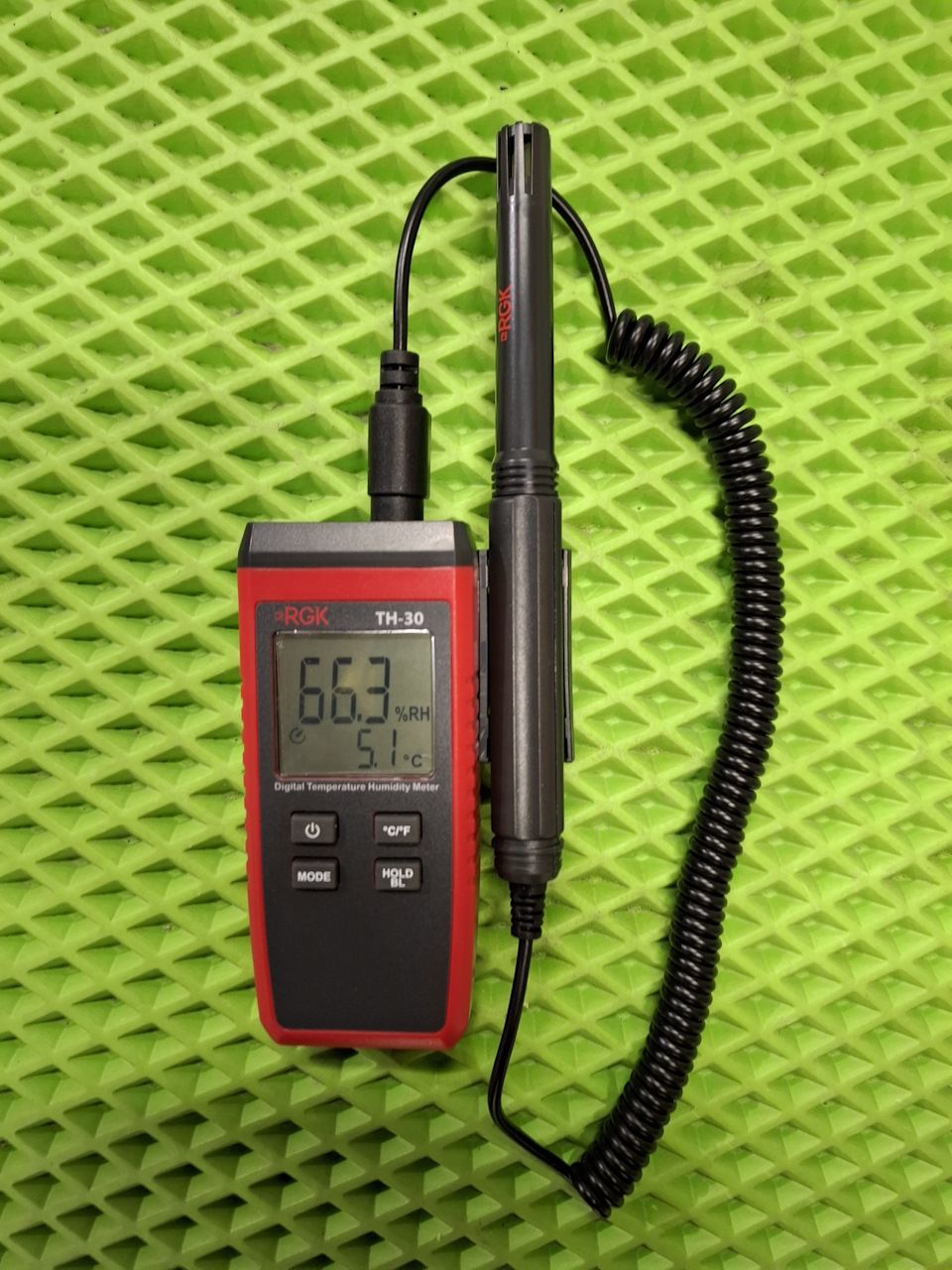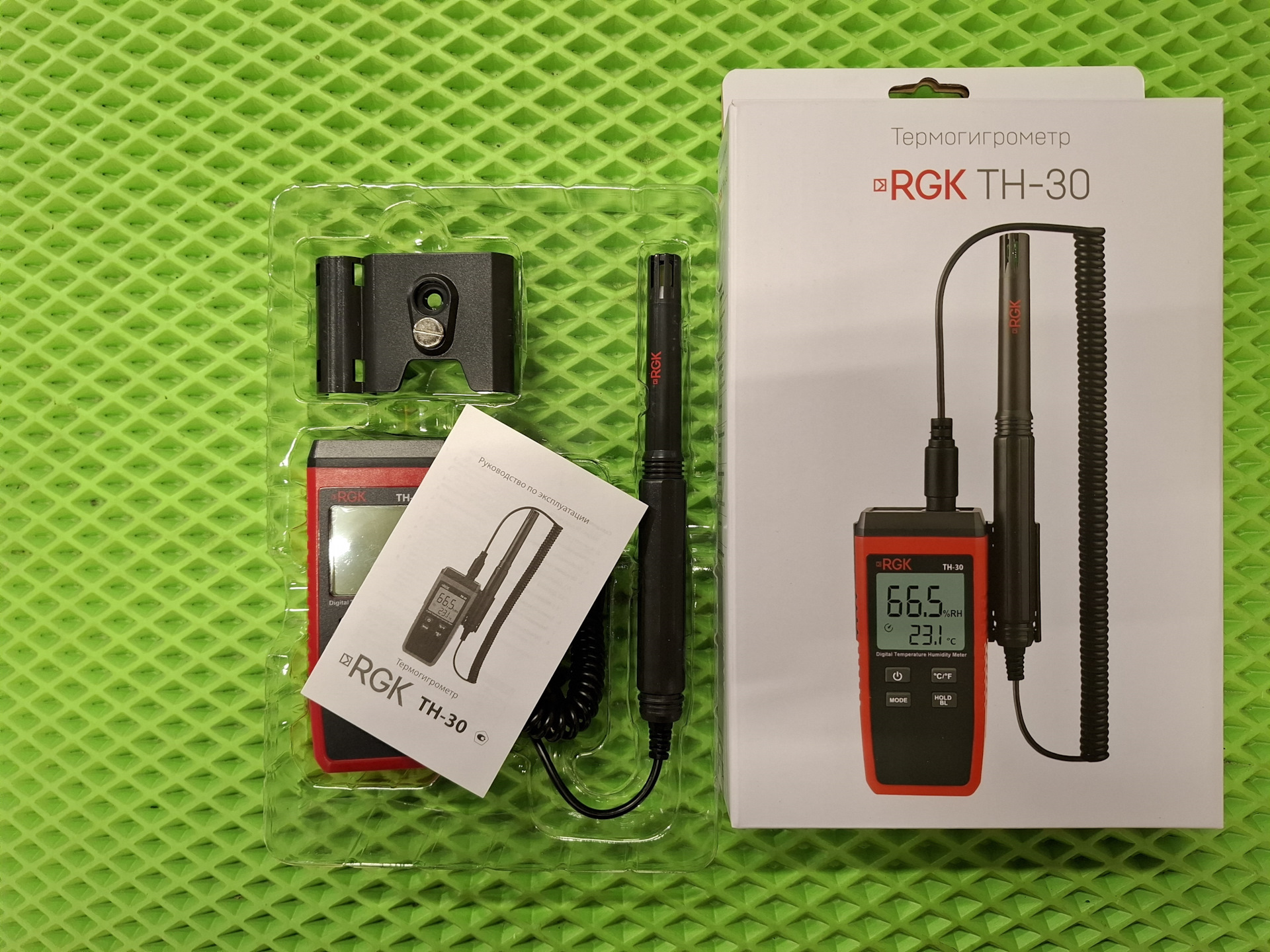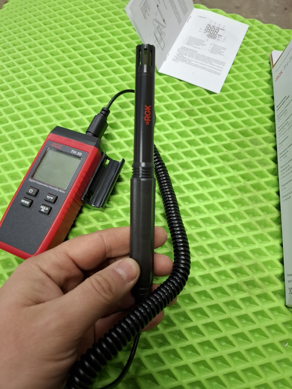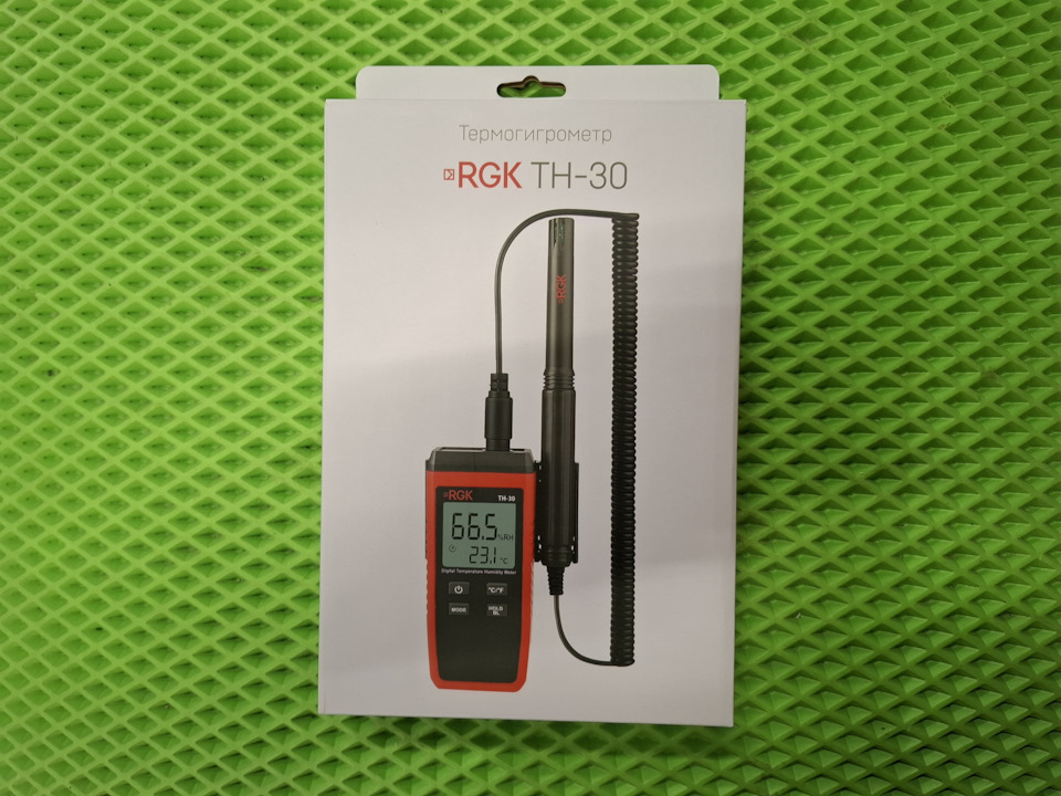 Термогигрометр RGK TH-30 — имеет выносной датчик, экран с отображением температуры и влажности, частота измерений 1 замер в секунду, в отличие от базовой RGK TH-12. Имеется возможность фиксации результатов, подсветка экрана, имеется специальный держатель для датчика.