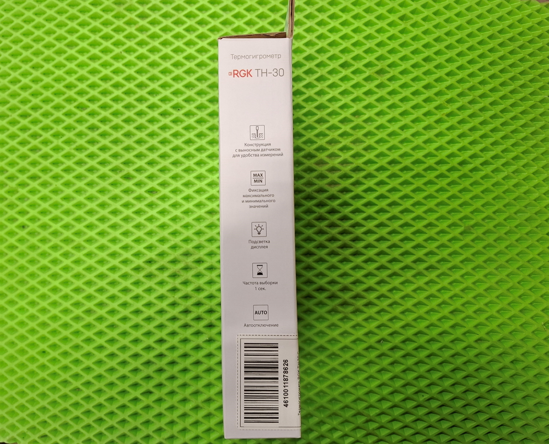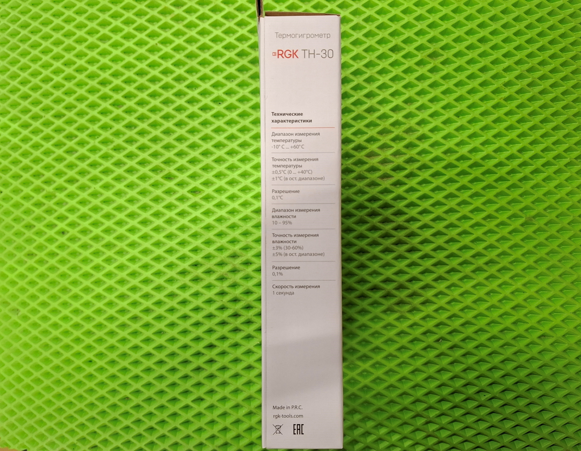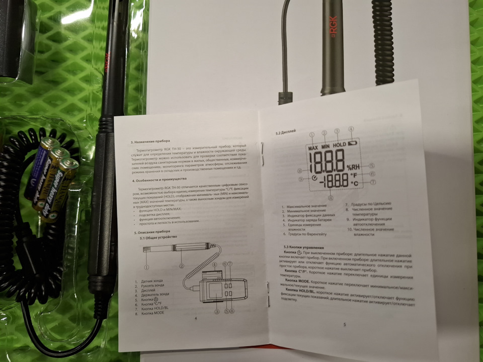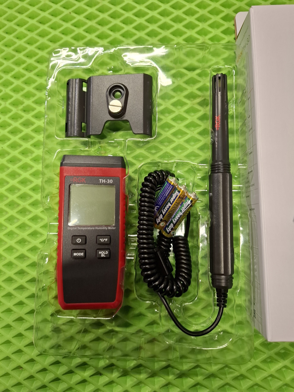 Термогигрометр RGK TH-30 — имеет выносной датчик, экран с отображением температуры и влажности, частота измерений 1 замер в секунду, в отличие от базовой RGK TH-12. Имеется возможность фиксации результатов, подсветка экрана, имеется специальный держатель для датчика.
