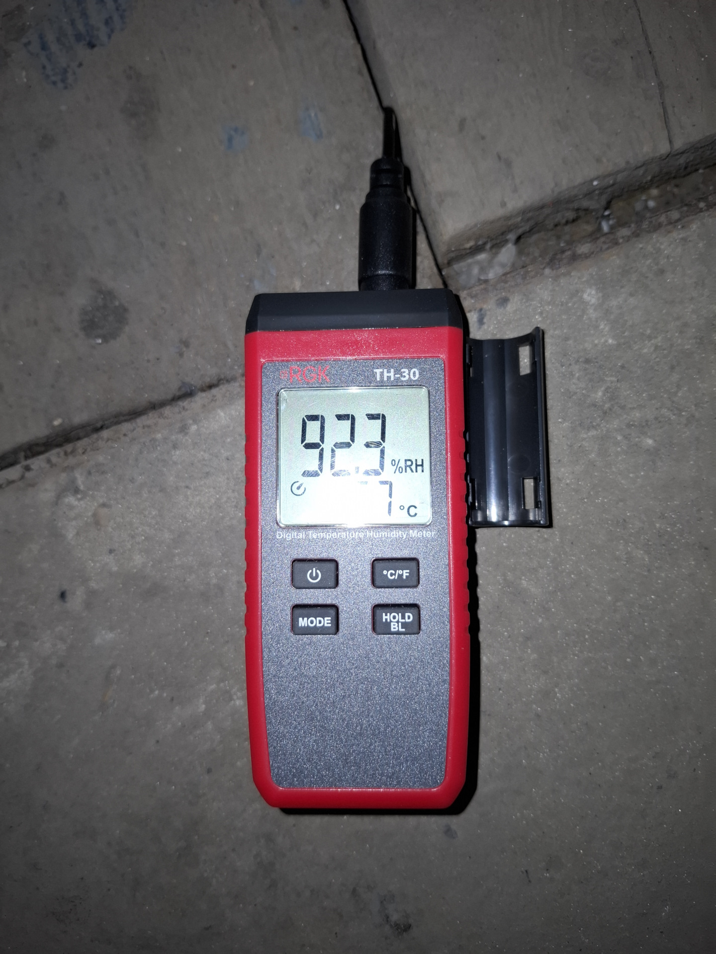 Гигрометром RGK TH-30 провел замеры в подвальной части, они составили 92% влажности и температуру 5,7°С. Результат меня не порадовал, если по температуре отлично, то влажность больше порядка 20%, оптимальная считается 50–70% в подвале гаража.