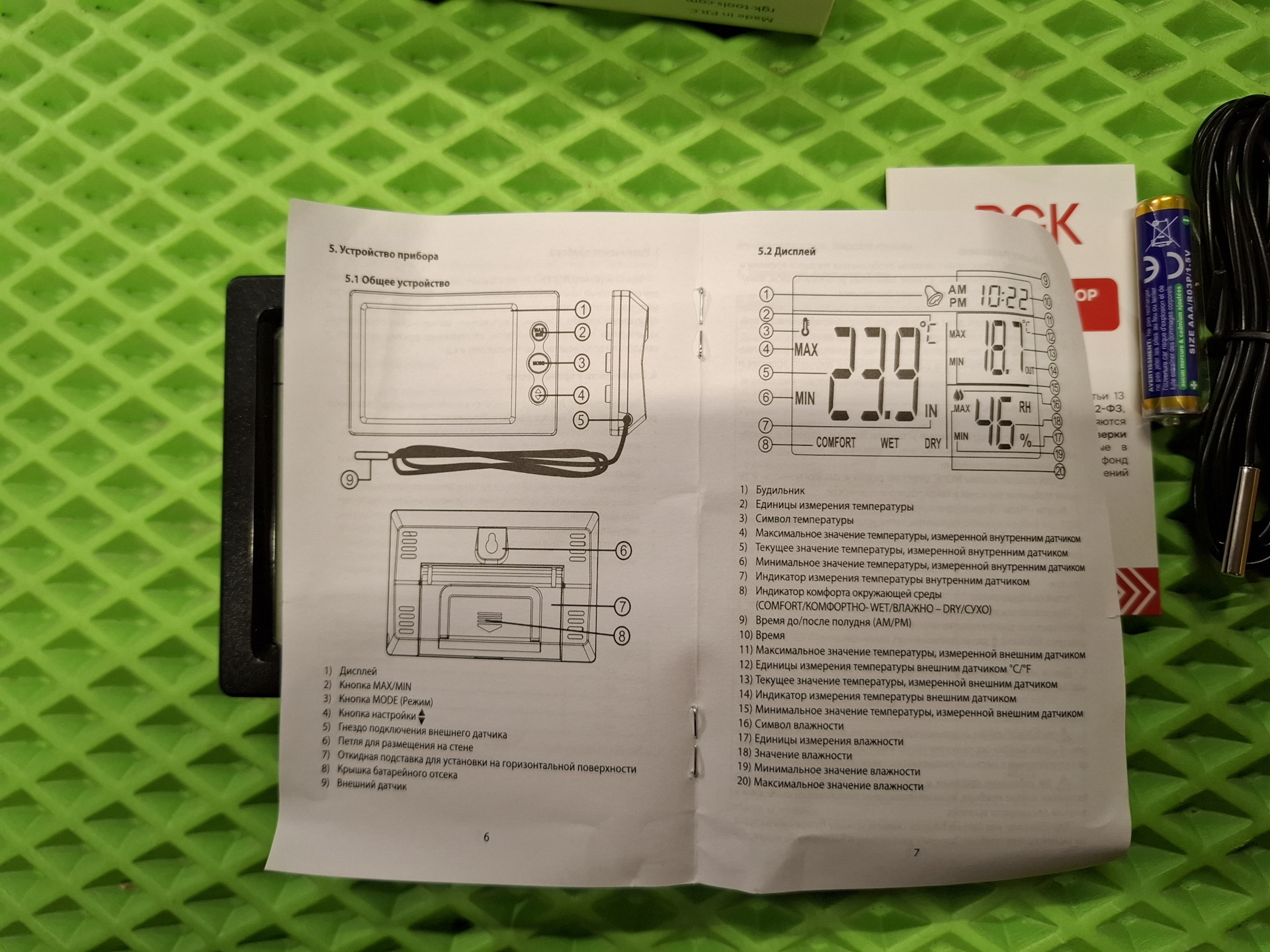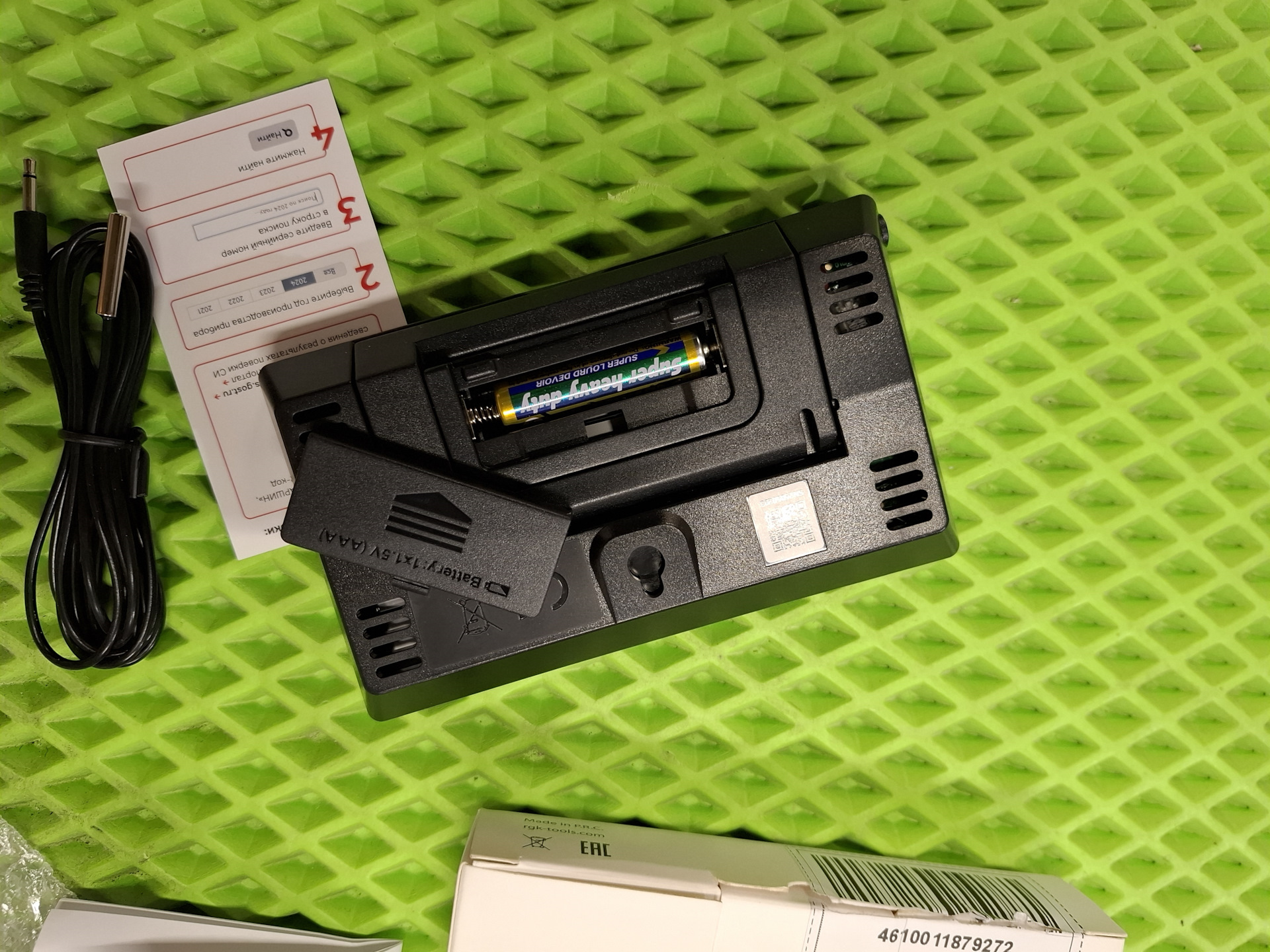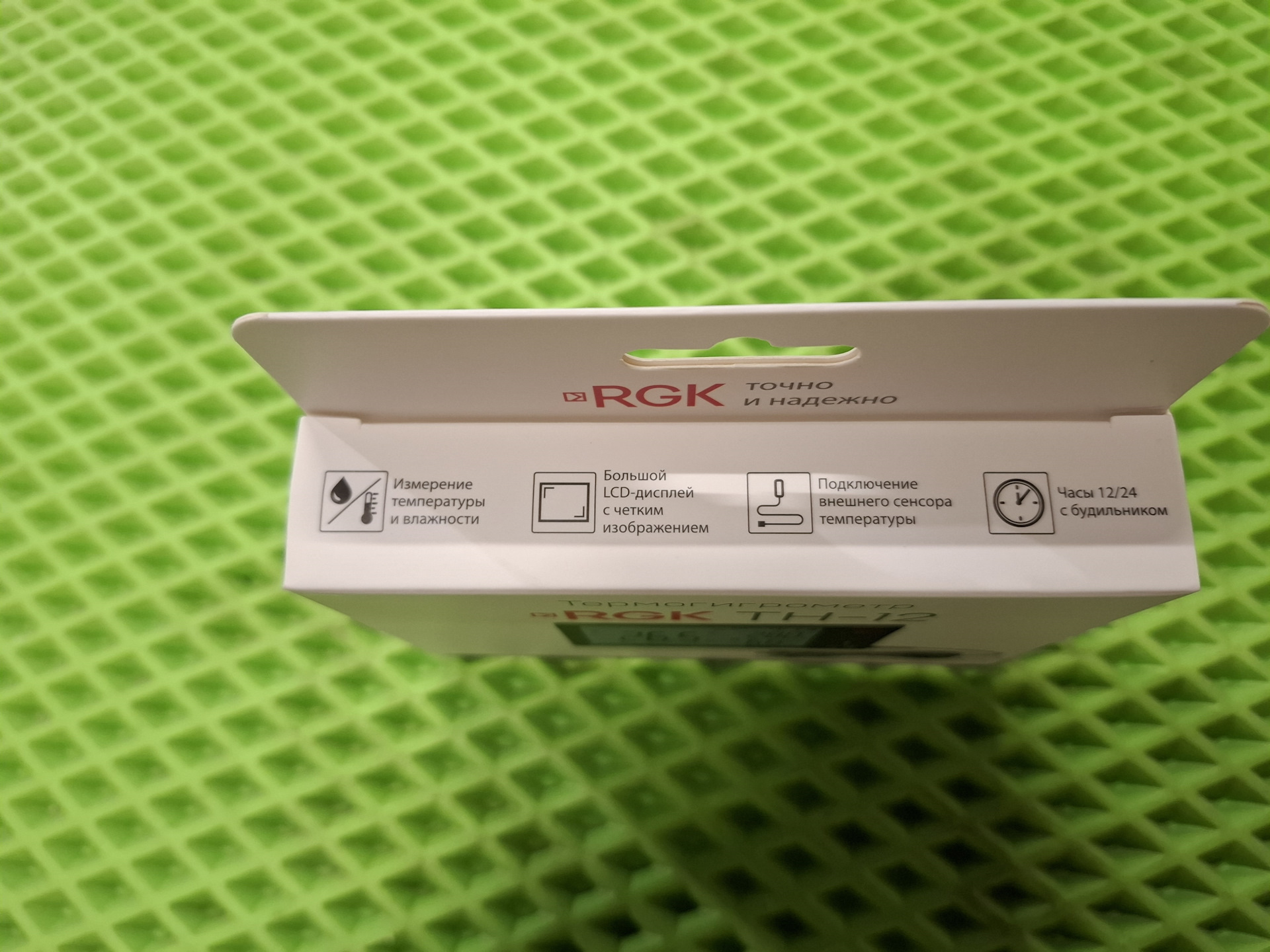 Немного ближе к общим параметрам термогигрометр RGK TH-12 — имеет большой экран, с выводом основной информации: температура и влажность, есть возможность выставить время и будильник для проведения замеров или иных манипуляций. Выносной датчик в комплекте и дает возможность выводить на экран температуру, в моем случае вывел его на улицу. Идеальным вариантом был бы вывод еще и влажности, для меня это параметр более важен, но как есть.