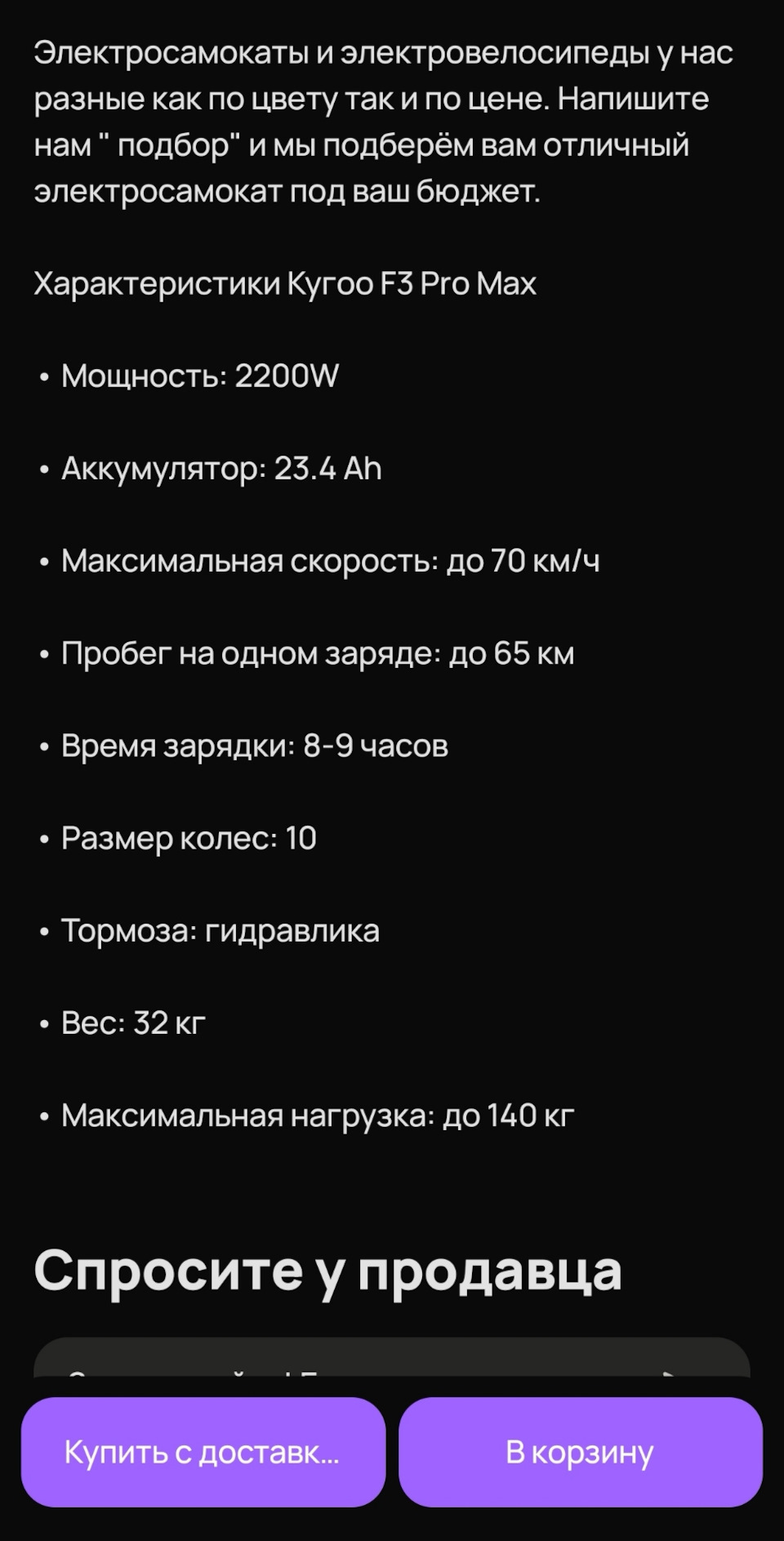 Такой во эт куррус как мопед, 159 веса легко, едет 75-85км/ч смотря настройки какие. Полный привод подключаемый. Короче танк в мире самокатов) это если нужна реально хорошая вещь. Кстати продается. Если чисто по городу то какой нибудь попсовый найн бот бери