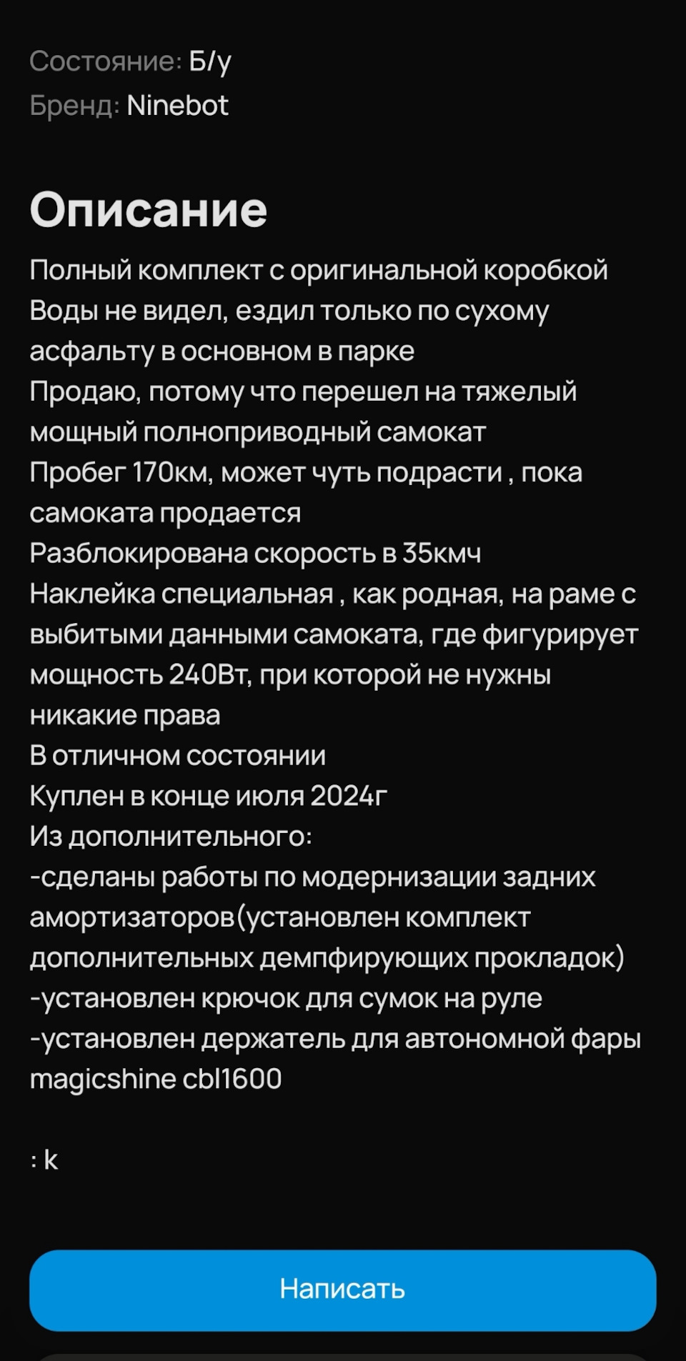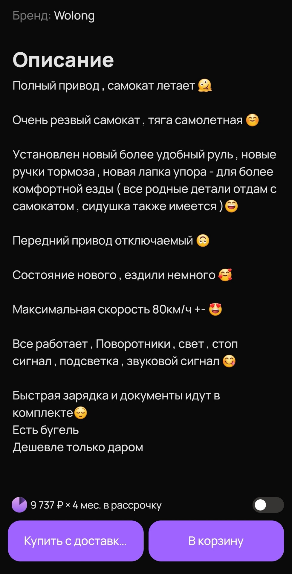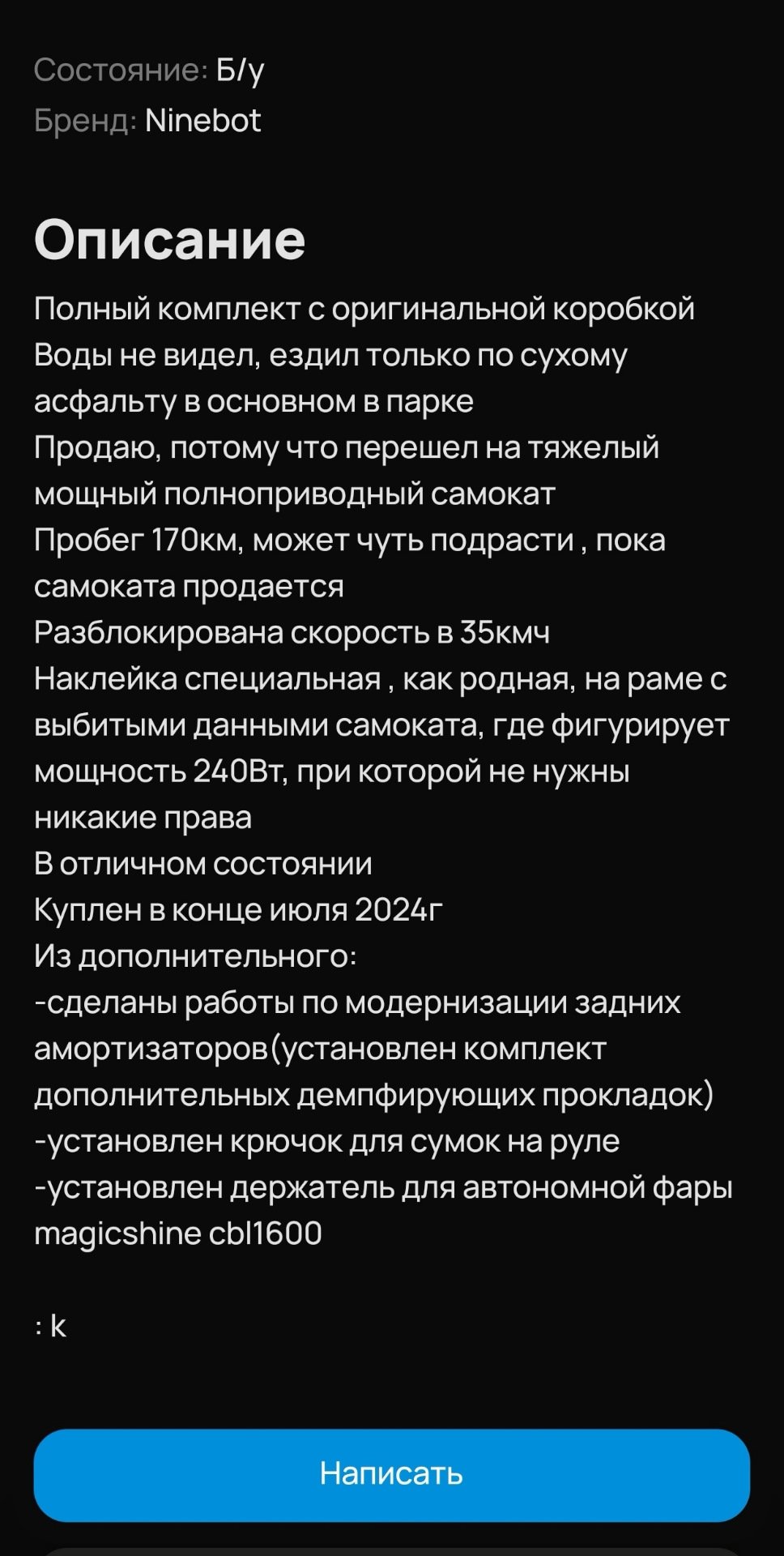 Сейчас самокат стоит уже лет 6, батарея на нём здохла вроде, хотел его продать но жена запретила 😃 сказала что надо починить .