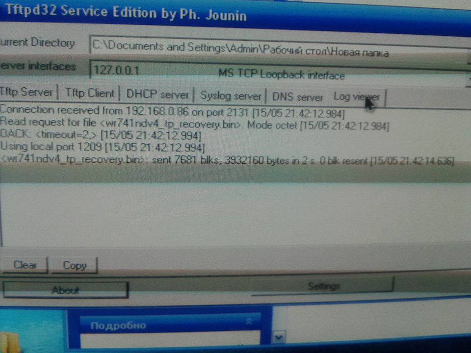 Connection received from 192.168.0.86 on port 3782 [11/11 11:49:16.754] Read request for file <wr740v4_tp_recovery.bin>. Mode octet [11/11 11:49:16.754] File <wr740v4_tp_recovery.bin> : error 2 in system call CreateFile Íå óäàåòñÿ íàéòè óêàçàííûé ôàéë. [11/11 11:49:16.754]