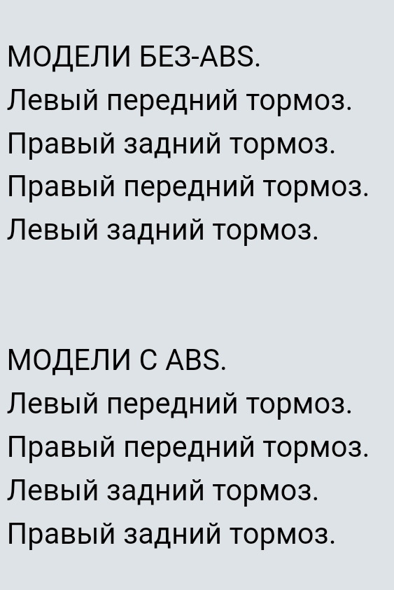 Подскажите, в какой последовательности прокачивать тормоза без АБС. Перебрал все суппорта. Прокачал по мануалу ( заднее правое, переднее левое, заднее левое, переднее правое). Все равно тормоза не айс. Ещё на просторах видел вариант, как на скриншоте.