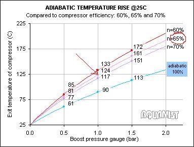 Для нашего примера, я стрелкой указал, что при температуре 25С, бусте (избыточном давлении) 1 бар и эффективности компрессора 65% температура поднимется с 25С до 124С. Это так, все верно (проверил)