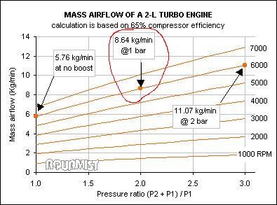 Как я уже говорил, в своем примере они используют 2.0 литра турбо мотор с эффективностью компрессора 65% (мощность 200 сил). Следующая диаграмма поможет нам определить расход воздуха необходимый для этого, при надуве 1 бар. Он равняется 8.64 кг/мин