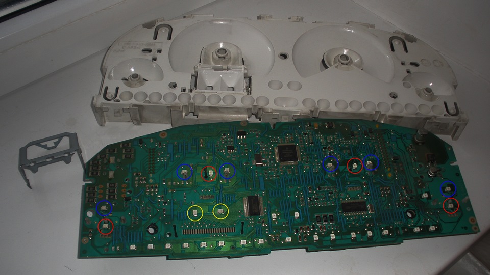 На фото выделены: синим — подсветка шкал, красным — подсветка стрелок, желтым — подсветка дисплея. Ну и результат развлечения с паяльником…