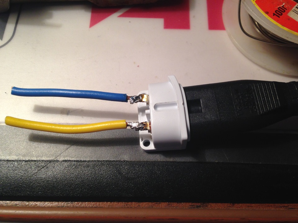 Готовим для подключения к новому питанию (паять рекомендую с вставленной вилкой питания — выполняет функцию дополнительного радиатора, отводит тепло от контактов)