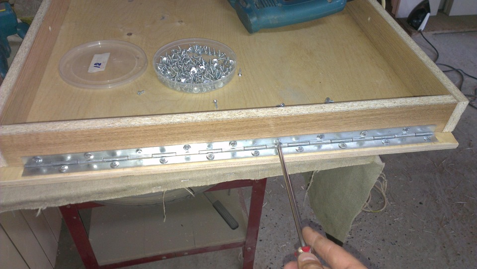 Под запаску я поставил рояльку что бы пол подымался, а две другие крышки будут просто вставляться в паз ящика