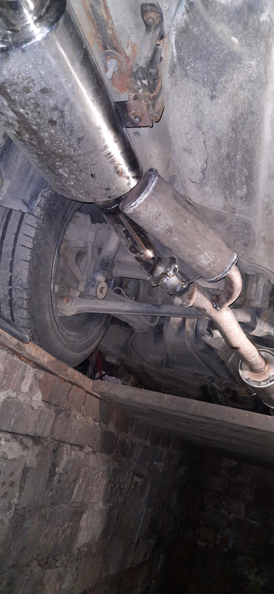 Потом выпуск был снят, отмыт, местами отполирован))) Соединение резонатора и выпускного тракта тщательно обварено. Резонатор направлен под углом 45 градусов для создания треугольника жесткости: