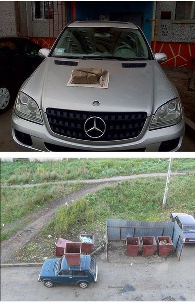 под кирпичик на мерсе заботливо положили газетку, наверное побоялись потом царапины своими соплями закрашивать :)