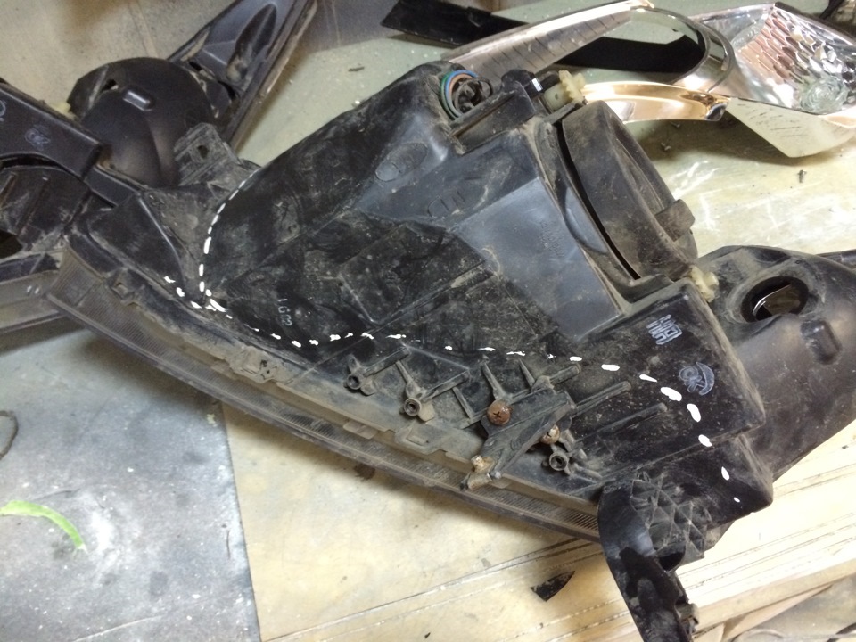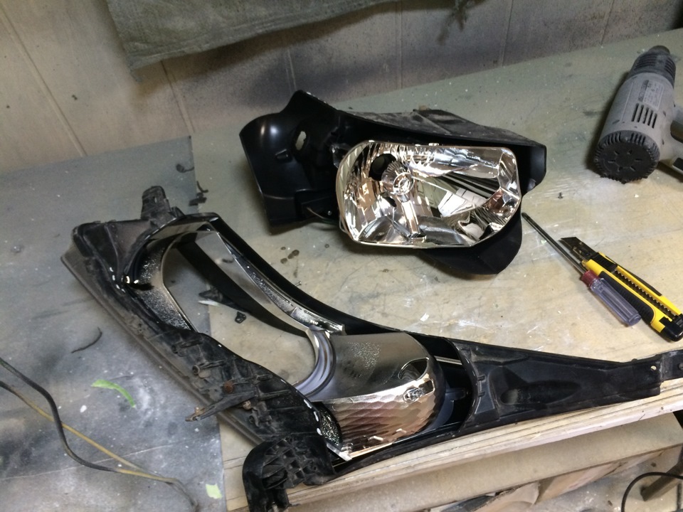 Решено было резать. Вот тут другое дело, на все про все уйдет минут 15, чтобы разрезать обе фары. Грел феном место реза и резал канцелярским ножом. Изначально наметил линию реза, обходя все крепления. Крепления резать не желательно, так как заклеенный шов потом может не выдержать нагрузки.
