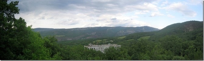Есть такое достаточно туристическое место — Сапун-гора. На ней есть смотровая площадка. Оттуда можно разглядеть, что среди леса на склоне одной высоты стоит пара двухэтажных домов. Но если подойти поближе, оказывается что не совсем это дома. А окна на них и вовсе нарисованы…