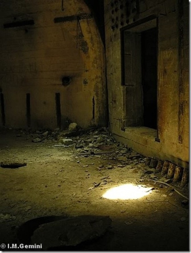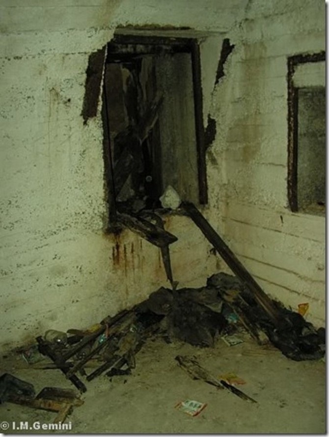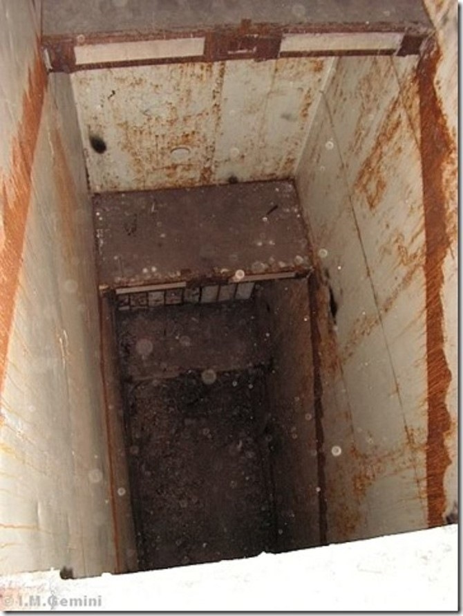 Вот он — чердак. Вниз — еще три этажа основных помещений. Потолок, стены, перегородки — все изнутри обшито железными листами. Точнее даже не так. После того, как были прорублены пещеры под бункер, его (бункер) стали строить внутри пещеры. Стены — это специальные железобетонные блоки. Сначала варили из железных листов куб в который вставлялась арматура диаметром 5 сантиметров. Все это заливалось бетоном и заваривалось сверху железным листом. И уже эти блоки составляли вместе и заваривали герметичным швом! А пространство между стенами бункера и стеной прорубленной пещеры тоже заливали бетоном…
