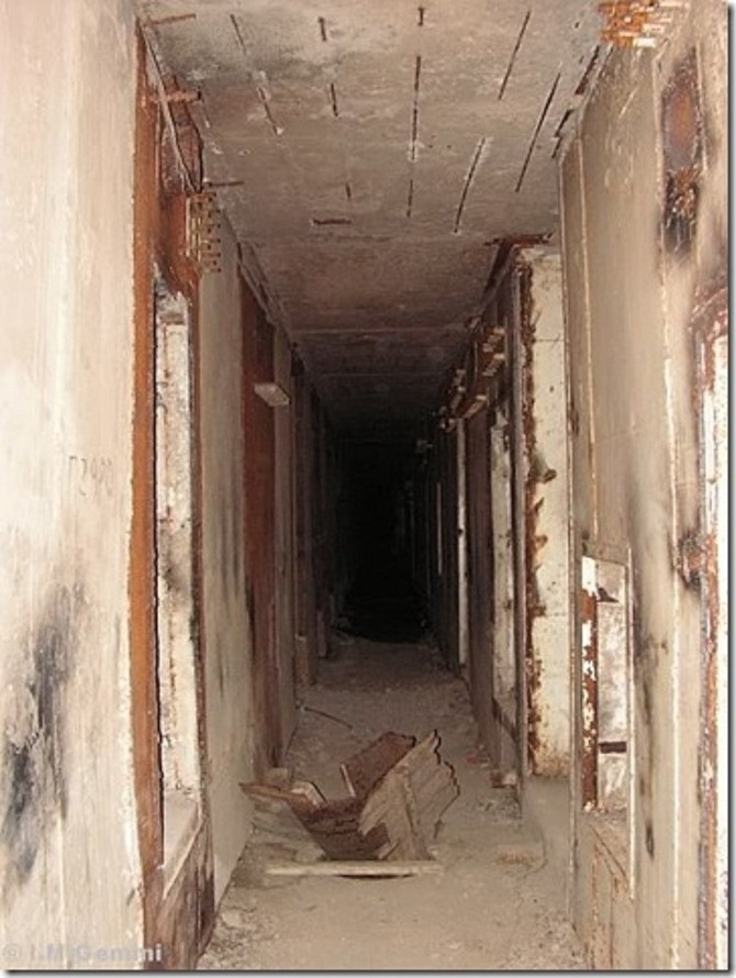 Этот провал когда-то был лестницей. Ступеньки срезали, потому что они были металлические.