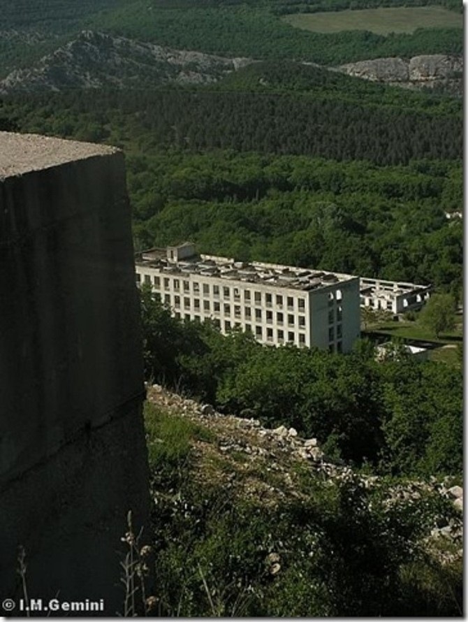 Тот же, кто не пожалеет усилий и отправится пешком по таинственному шоссе — через двадцать-тридцать минут наткнется на останки колоссального по своим масштабам “Объекта 221”. Лет двадцать назад таких “пешеходов” вежливо остановили еще на подходе к Морозовке. Поинтересовались бы, кто такие и что собираются делать. Потом так же вежливо выпроводили бы. А если б кто-то рискнул по расспрашивать местных жителей, почему по шоссе так часто проносятся колонны грузовых машин и куда они направляются — получил бы уклончивый ответ: "Здесь каменный карьер". Кстати, так было велено называть “Объект-221” даже тем, кто его создавал. Все, что мы знаем сейчас, — это то, что начали строить командный пункт, целый подземный город, в 1977 году. В нем планировалось разместить штаб Черноморского флота и обслуживающий персонал. Есть информация, что здесь в случае начала войны должны были разместить руководство высокого ранга, отдыхающее на дачах Южнобережья и в окрестностях Севастополя. “Объект 221” уходит вглубь почти на 200 метров, имеет четыре подземных этажа, два основных входа. Вверху, в самой горе, скрыты вентиляционные шахты. Общая площадь — 17,5 тысяч квадратных метров, это самое крупное подземное сооружение в Крыму. Это кажется невероятным, но такая масштабная стройка велась почти незаметно. Был сформирован специальный “подземный” стройбат, усиленный специалистами, имевшими опыт сооружения бетонированных шахт для баллистических ракет. Только за один год были пробиты два 192-метровых ствола, со дна которых пошли в ширь горы штольни главного укрытия.