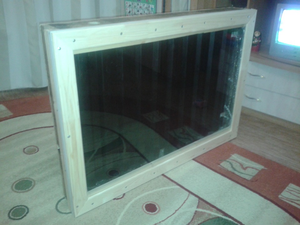 Вот мой первый серьёзный солнечный воздушный коллектор. Это деревянный утеплённый фольгированным изолоном короб с покрашенным в чёрный мат абсорбером из куска профнастила. Я не особо поверил рассказам на форуме и решил всё опробовать сам… Нашёл кусок грязного профнастила и отмыл его. Не смотря на яркое солнце оцинкованный профнастил не высыхал тк был сильный минусовой ветер… Через 15 минут он всё-же просох… В имевшемся баллончике было немного краски и я кое как окрасил лист. Через пять минут подошёл проверить лист и обалдел! Не смотря на плохую окраску и сильный холодный ветер лист разогрелся так что еле терпела рука! Это победа! ))) Далее всё закрутилось и позже прикрепил стекло. Видел разработку из пивных алюм банок, идея хорошая и работает, но уж очень заморочисто… Решил я следующий коллектор делать из демонтированной оконной рамы со стеклом (их полно на свалках), а в качестве абсорбера использовать те же пивные банки, но не полностью, а только их боковины. К сожалению установить сие чудо инженерной мысли не удалось((( ибо нет у меня ни дачи ни гаража.