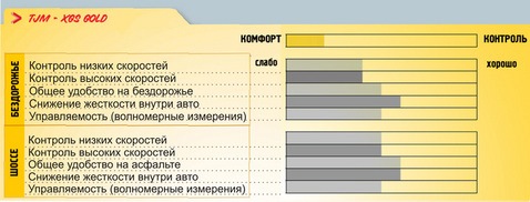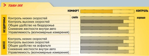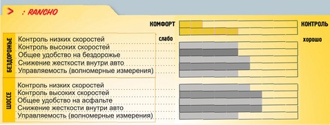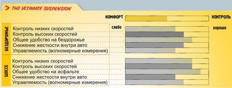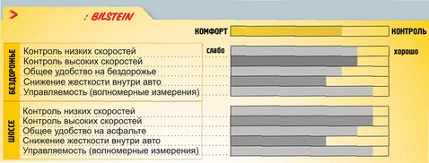 Мнение Брюса: Эти амортизаторы дают немного жесткий ход. Хотя на бездорожье они и были немногожестче остальных, при езде по ухабах это не создавало дискомфорта, причем амортизаторам удавалось уверенно справляться со своей задачей как при ударе, так и на отскоке, чего не скажешь о других моделях. В качестве компенсации за жесткий ход на бездорожье вы получаете удобство управления за рулем. С моей точки зрения, управление было очень точным и оставило приятные впечатления. Как на бездорожье, так и на асфальте эти амортизаторы обеспечили очень устойчивую езду.