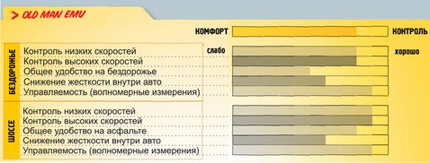 Мнение Брюса: это одни из самых мягких амортизаторов на испытании. Водителю они не гарантируют уверенности при контроле веса на ухабистой местности. Если вам нравится мягкий ход, то эти амортизаторы вам подойдут. Из всех видов покрытия, на которых проходили испытания, лучше всего они себя показали на бездорожье при низкой скорости.