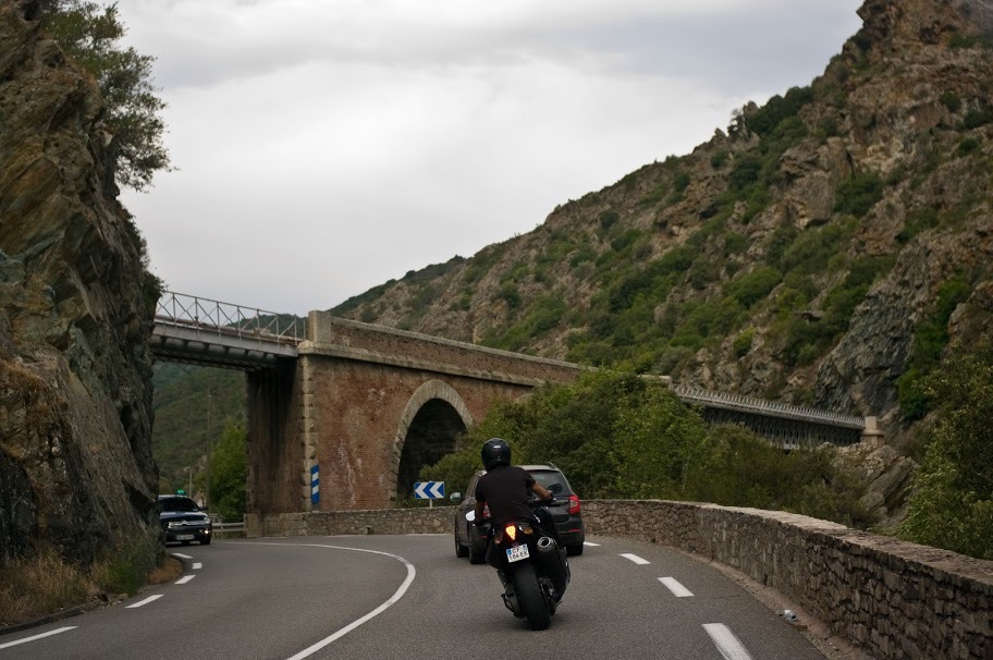 От Бастии на юг идет широченная дорога и мы быстро превышаем привычные нам средние 35 км/ч. Транспортная сеть острова все-таки вполне пригодна для перевозок. Помимо автодорог по Корсике проложена 232-километровая сеть железных, соединяющая Бастию, Аяччо и Калви в форме звезды. Местные РЖД включают в свой состав аж 16 локомотивов и поездов :) Участок от Бастии до Порте-Виехо (почти Бонифачо) был разрушен еще по времена II-й мировой и так до сих пор не восстановлен. Во время нашего визита что-то было также разрушено и в центральной части, между Бастией и Аяччо сообщения не было. Ж/д мост: