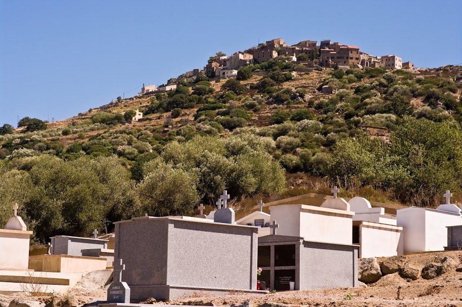 Усопших не хоронят в земле (очень тяжелые каменистые почвы), но и не сжигают (корсиканцы люди религиозные, католики). Гробы помещают в ячейку из бетона и/или камня и тщательно замуровывают. Все. О самом же поселении особенно сказать нечего. Узкие улочки, узкие проходы между домами. Печи понравились — они почему-то снаружи. Странная идея для отопления и не менее странная для приготовления пищи, плитки то нет.