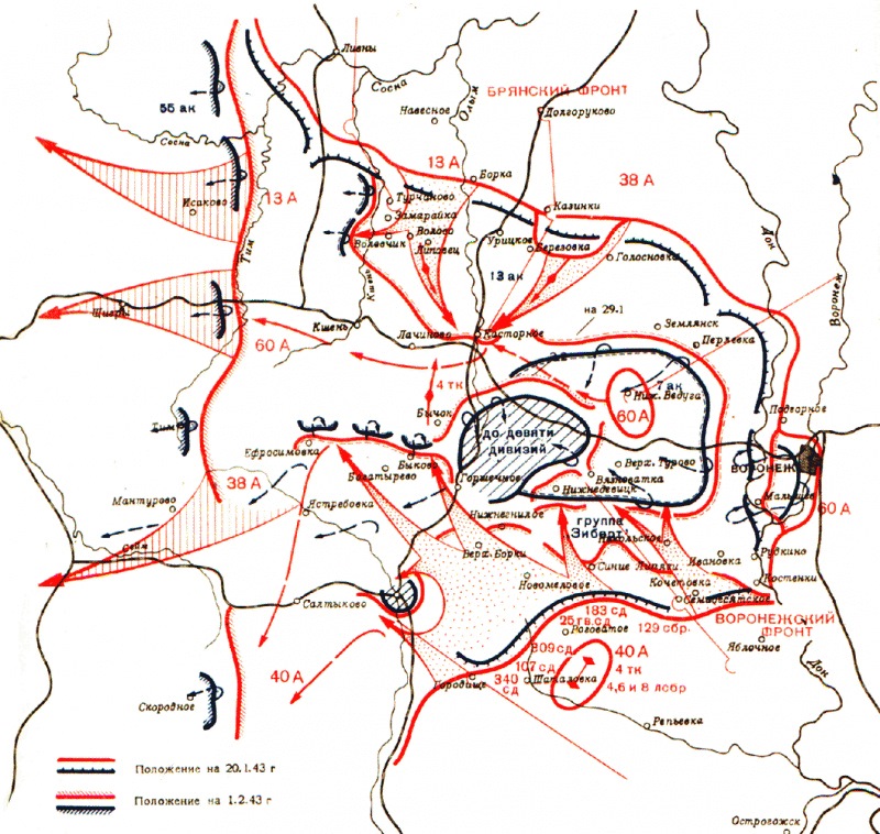 Осенью 1942 года во вражеской обороне у Воронежа образовался выступ, своего рода «Воронежская дуга», глубиной около 100 километров при длине основания около 130 километров. Внутри этого выступа располагались 10 немецких дивизий 2-й армии и 2 венгерские дивизии. Советское Верховное Главнокомандование решило нанести удар по флангам этого выступа. Воронежско-Касторненская операция началась 24 января 1943 года, в результате этой операции 25 января были полностью освобождены все районы города оккупированные германцами, а на всем воронежском направлении вся вражеская группировка оказалась в полном окружении, получился так называемый Сталинград на верхнем Дону. Ожесточённые бои продолжались до 17 февраля. Противник пытался прорвать окружение, но был разгромлен. Враг потерял до 11 дивизий (9 германских и 2 венгерских), почти всё тяжёлое вооружение и технику. Разгром немецко-фашистских войск под Воронежем в ходе Воронежско-Касторненской операции с полным правом позволяет говорить о ней как о крупном успехе советских войск в 1943 году.