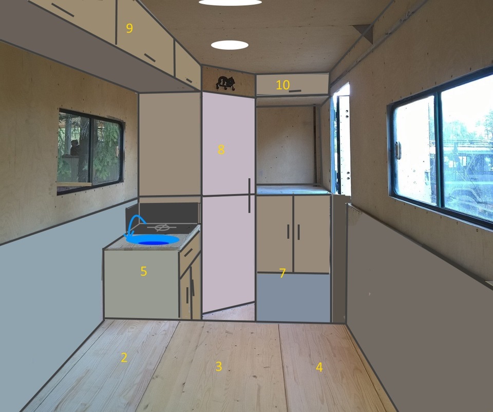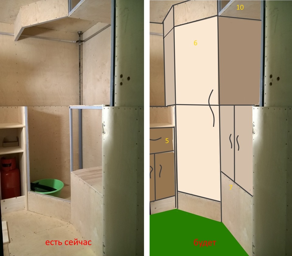 К первому рундуку примыкает сразу мини-кухня. Размер столешницы в которую будет вмонтирована мойка и газовая комфорка 500мм на 400мм. Сам шкафчик имеет размер 500мм на 800мм и глубину 400мм. В нем будет размещен газовый баллон ( обязательно с газоанализатором! И клапаном отсечки газа!). Также слева от баллона будут сделаны полки для хранения тяжелых пищевых запасов! =)) Полочка под раковиной пока не получила своего применения, но скорее всего уду мудрить в ней раскладывающийся элемент для увеличения рабочей поверхности! Это еще под вопросом!
