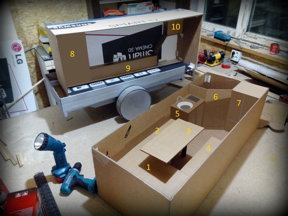 просто отличный проект! тоже были мыслишки про такое, но только в исполнении стандарта- под тентом что бы все было, а сам тент с углов на шнуровке, что бы на стоянке можно было его как козырек использовать. так прицеп не отличается от обычного и на крыше не будет стоять вода