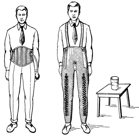 При наполнении воздухом камеры расширяются и оказывают давление на тело (фиг. 4). Проверка эффективности камер, расположенных на различных участках тела, показала, что самой эффективной частью костюма является брюшная камера. Оболочка костюма шьется в виде двух штанин, соединенных широким поясом. Ткань, применяемая для изготовления оболочки костюма, должна быть прочной, хорошо сопротивляться истиранию, обладать малым удлинением, достаточной воздухопроницаемостью и быть стойкой к атмосферным воздействиям. Оболочка, сшитая из двух штанин с широким поясом, удобна в эксплуатации. Разъемные застежки «молния» позволяют быстро надеть и снять костюм. Подгонка костюма по ширине производится шнуровкой. Такая подгонка делается только один раз при первом одевании, при последующих одеваниях летчик действует только замками застежки «молния».