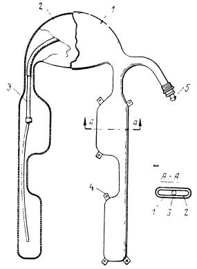 Для обеспечения противоперегрузочными костюмами всего контингента летного состава изготавливается несколько «ростов» костюма. Необходимое количество «ростов» зависит от типа костюма и не превышает 8—12. Камеры изготавливаются из мягкой резины толщиной около одного миллиметра. На фиг. 5 показана пяти-секционная камера противоперегрузочного костюма. Емкость всех камер составляет пять литров. Для предохранения камер от чрезмерного растяжения и разрыва при наполнении воздухом на них надевается специальный тканевый чехол. Воздух в камеры подается по гибкому резиновому шлангу. Для предотвращения пережима шланга при перегибах он сделан каркасированным, т. е. внутри резиновой трубки пропущен каркас из стальной проволоки, навитой в виде пружины. К чехлу пришиваются петельки с кнопками. Эти кнопки фиксируют положение чехла с камерами и препятствуют его перемещениям внутри костюма. Эффективность работы ППК в значительной степени зависит от правильной его подгонки. Костюм должен плотно облегать тело, но вместе с тем при отсутствии давления в камерах не должен вызывать болевых ощущений и затруднять дыхание и движения. Костюм надевается на обычное летное обмундирование, т. е. поверх брюк. Поясная часть костюма надевается под китель или тужурку. Зимнее обмундирование, в том числе унты и меховые сапоги надеваются поверх ППК. Если надеть костюм на утепленную одежду, то его эффективность снизится, так как характеристики давлений на тело в этом случае резко меняются. Вес противоперегрузочного костюма не превышает 2— 2,5 кг.