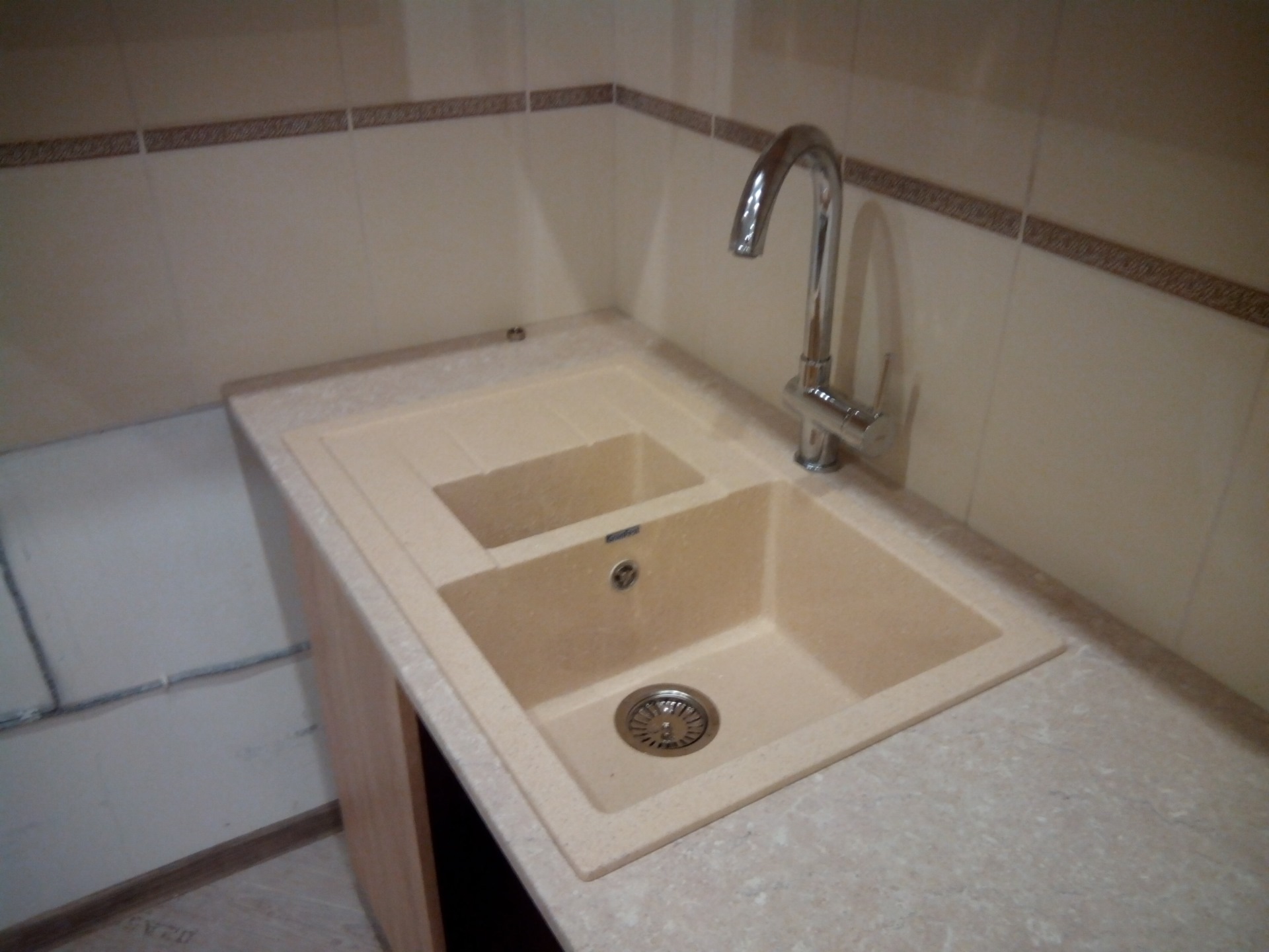 Интересно вы смеситель решили примостить… Почему так?) Обычно в мойке сверлят отверстия (там даже спец. разметка для этого есть) Намного практичнее. А счас у вас в этом труднодоступном месте грибы будут расти, т.к. как следует вы тут уже не помоете. Мойка похожа на Blanco Metra 6s Compact, но похоже, что реплика)) Там еще клапан должен быть…