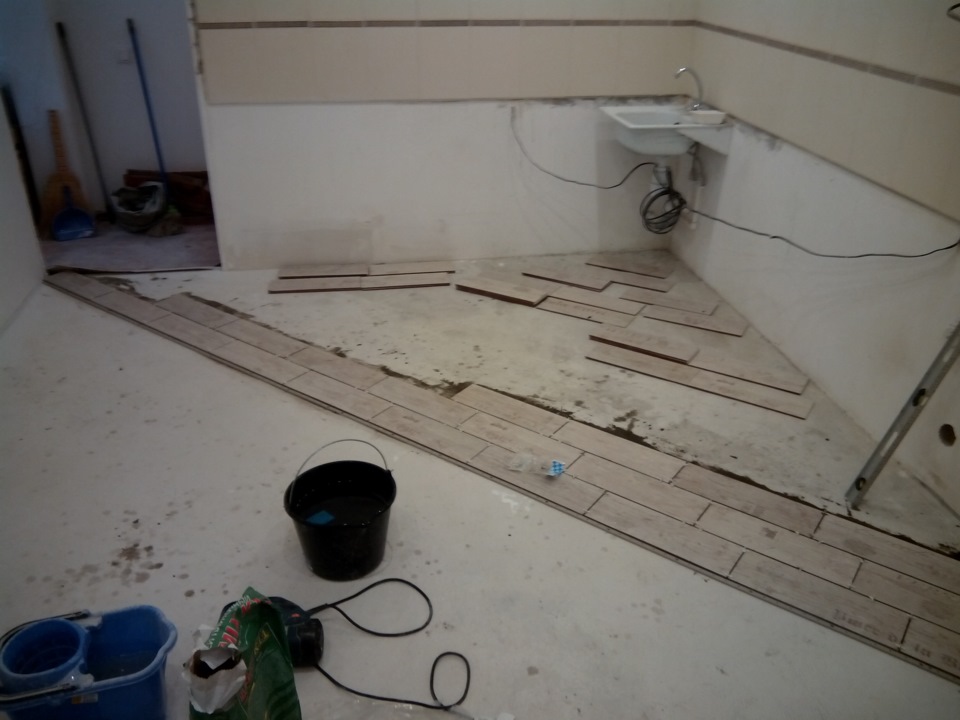 Пол решено было сделать двух зонным: плитка и паркетная доска. Разметку сделал треугольником.