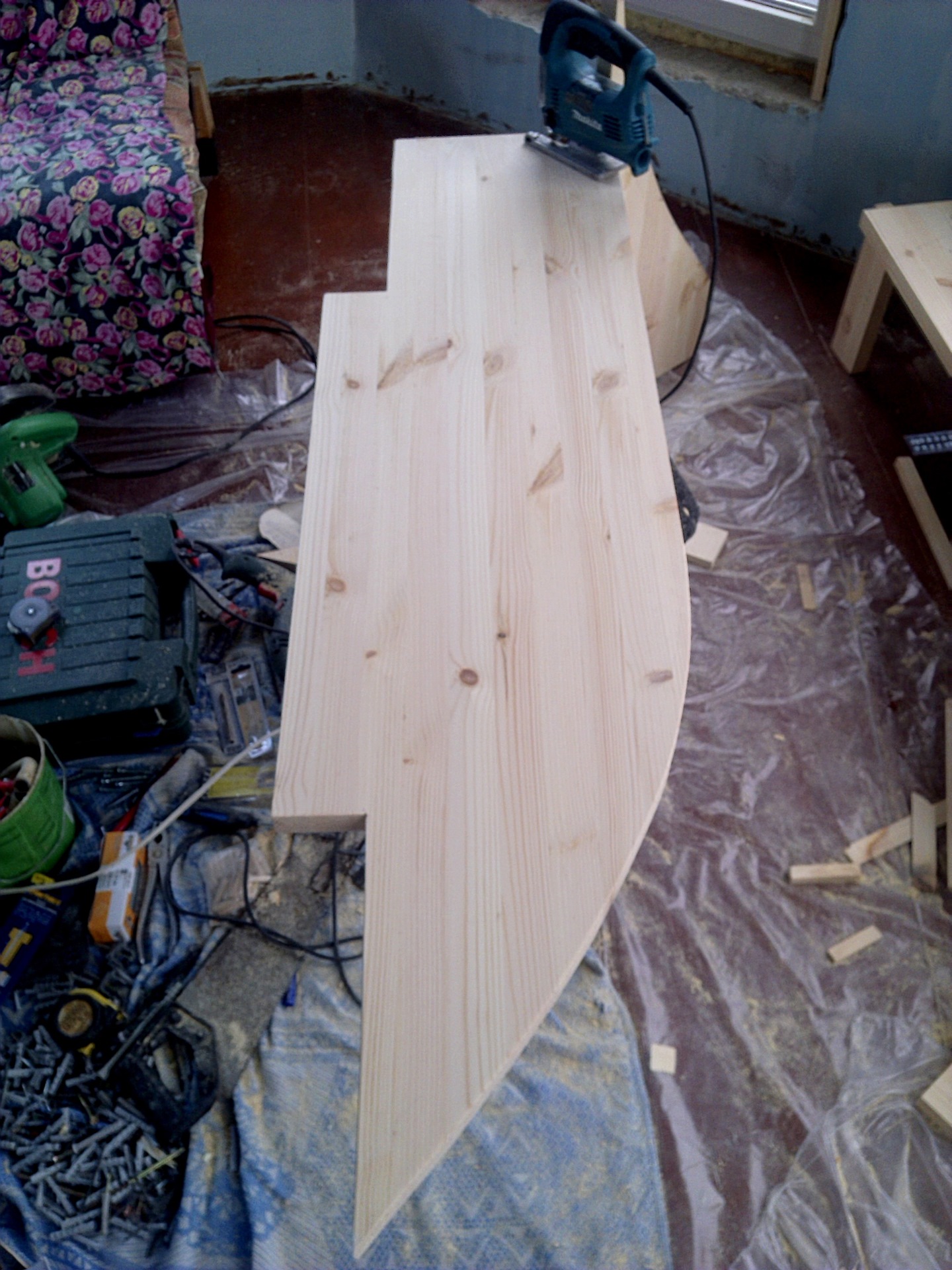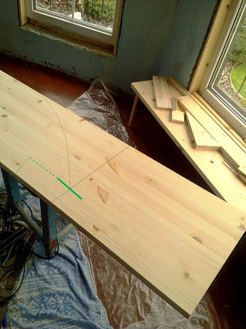 После нанесения всей разметки пилим всё эл.лобзиком. Разметку углов между щитами и закругления по краям делаем только после нанесения планируемых вырезов на подоконнике, той части, где подоконник будет вставлен под нижнюю часть окна внутрь (под окно).