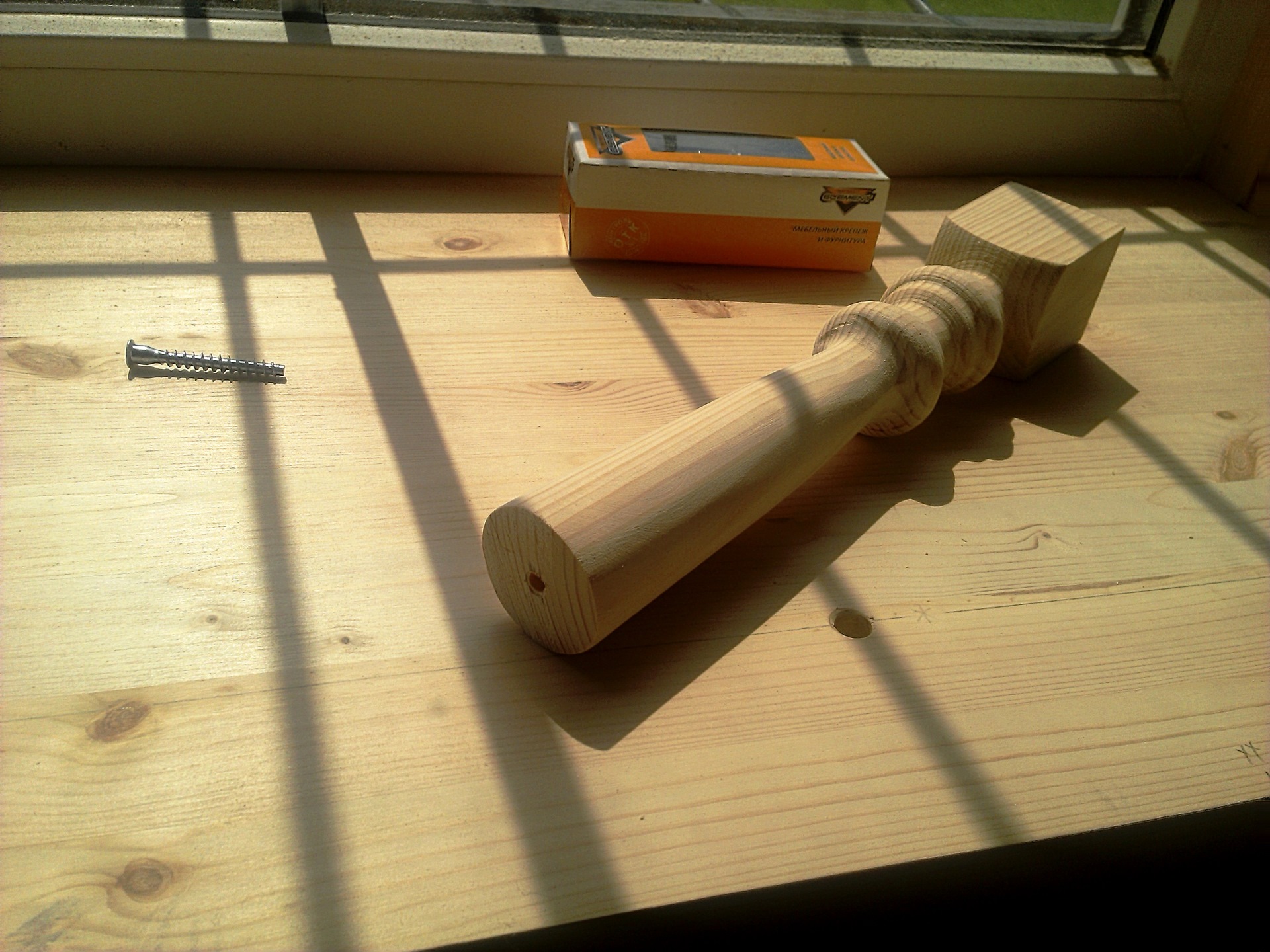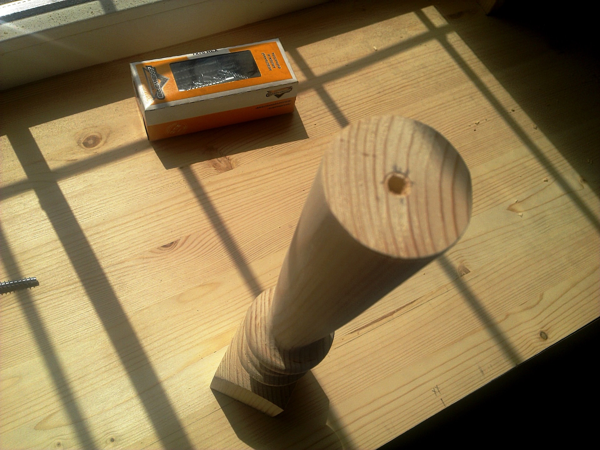 Размечаем места крепления ножек. Сверлом для конфирматов сверлим отверстия в подоконнике и самой балясине. Прикручиваем балясины к подоконнику конфирматами. Закрываем места закрепления деревянными чепиками сверху. Чепики сажаем на клей. Отпиливаем чепики по наружной поверхности подоконника. Подшкуриваем.
