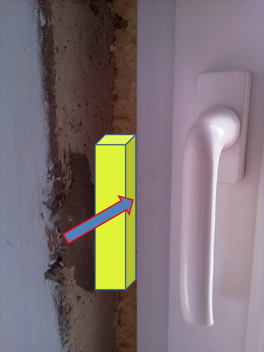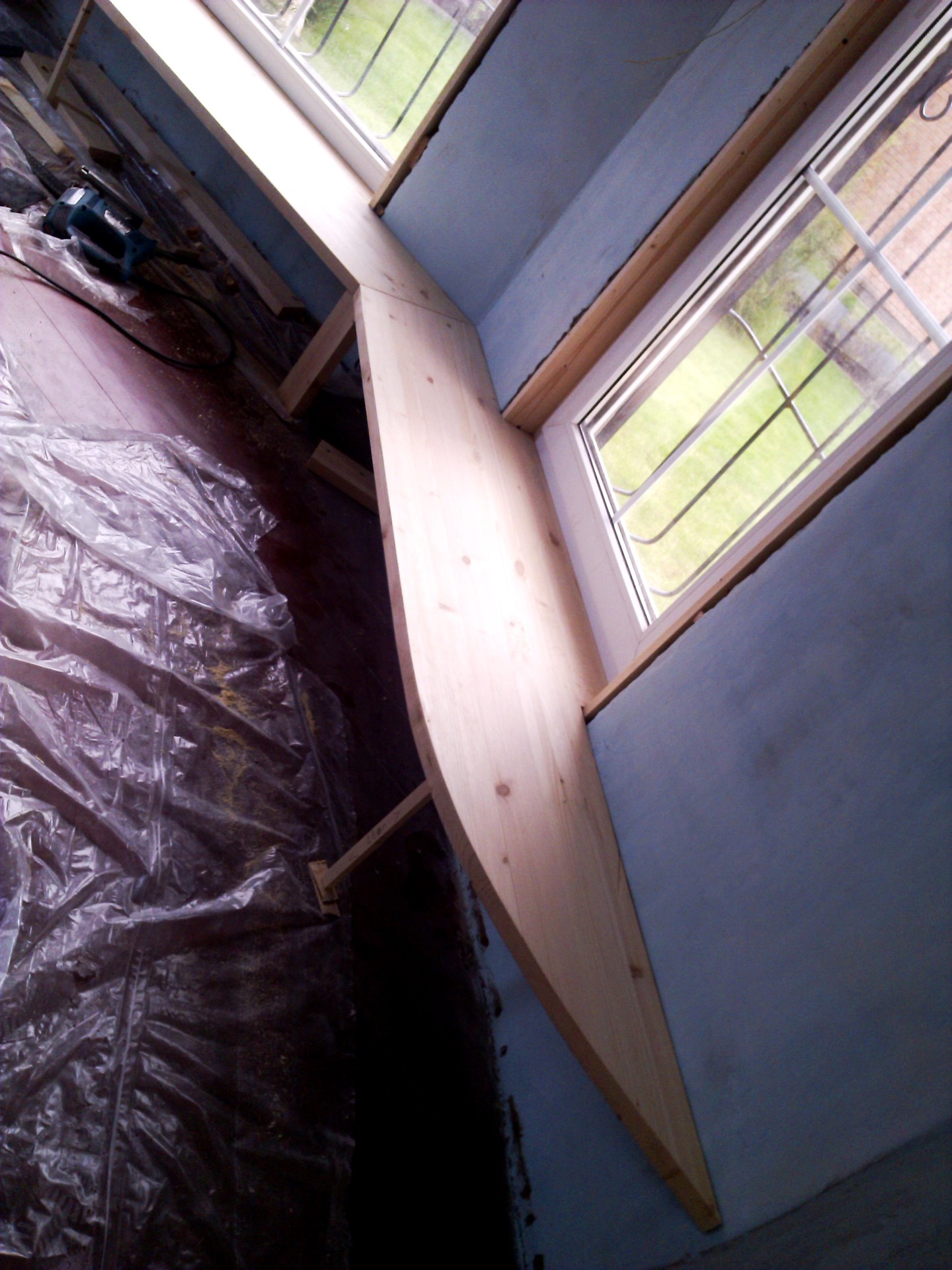 Когда все вырезано в размер, вставляем заготовки на свои места. Снизу подоконников забиваем бруски "в распор", чтобы поджать подоконник к окну. Плоскости подоконников готовы.