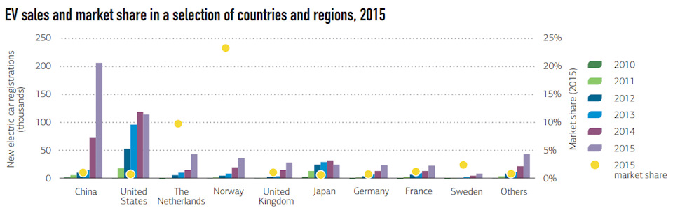 Кроме Норвегии и Нидерландов, рыночный барьер в 1% электромобили взяли ещё в пяти странах: Швеции, Дании, Франции, Китае и Великобритании.