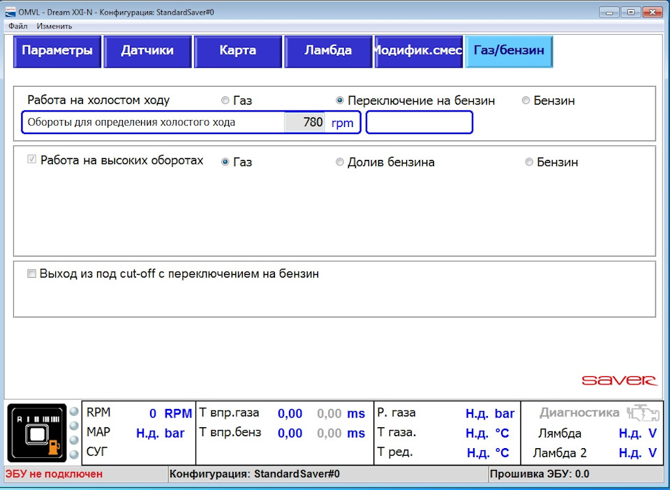 Какой контроллер стоит, черный такой с одним жгутом проводов, или металлический с двумя? Смысл в чем: обновляешь комп газовый и у тебя появляется галочка, там где ты делаешь автокалибровку, там так и будет улучшенная калибровка, делаешь автокалибровку без нагрузки на двигатель (без света, кондиционера и тд.) убеждаешься, что жиклеры ты подобрал правильно все параметры в норме, ставишь галочку напротив улучшенной калибровки и нажимаешь туда, пока газовые мозги не соберут данные с бензиновых и не перерасчитают их конкретно под твой двигатель, на газ ты не переключишься. Т.е. ты катаешься на бензине в разных режимах, на ХХ, в нормальном режиме, ускорение, нагрузка и .т.д. Как только все поля будут заполнены машина сама перейдет на газ, с уже собранной картой. Если потребуется (хотя такого не было) делаешь небольшие корректировки с помощью сканера. Если же твой контроллер не поддерживает этой функции могу предложить следующее: во вкладке конфигурация, открываешь конфигурация — газ бензин, далее работа на холостом ходу — выбираешь переключение на бензин, или бензин и выбираешь минимальные обороты для газа. Другими словами, если обороты двигателя, упадут ниже заданных, будет идти долив бензина или полностью работа на бензине. Бывает такое, что при неправильной настройки OMVL, при нагрузки на двигатель он начинает глохнуть, бывает даже от гидрача))) Чтобы было более понятно выложу примеры.