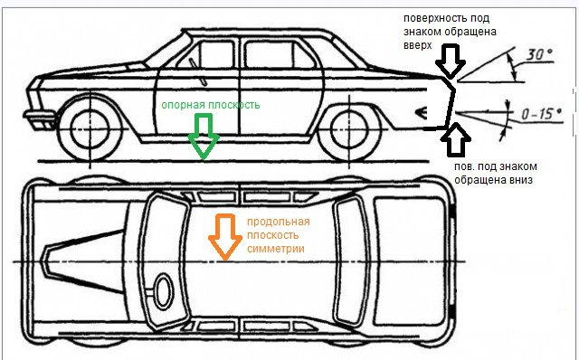 Примечание. Если конструкция транспортного средства не позволяет установить регистрационные знаки перпендикулярно опорной плоскости транспортного средства, то для регистрационных знаков, высота верхнего края которых не более 1200 мм, допускается этот угол увеличить до 30°, если поверхность, на которой установлен знак, обращена вверх, и до 15°, если поверхность обращена вниз.